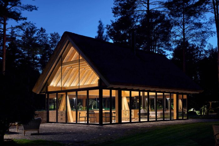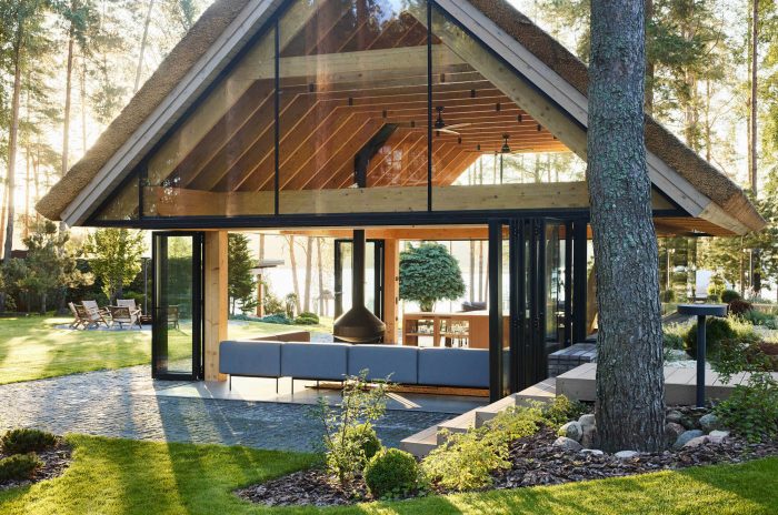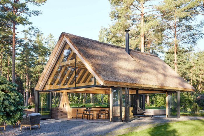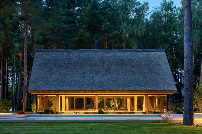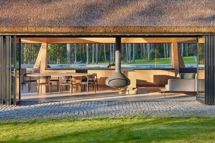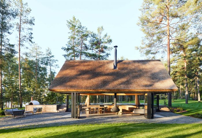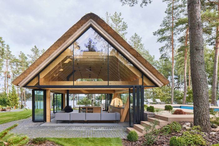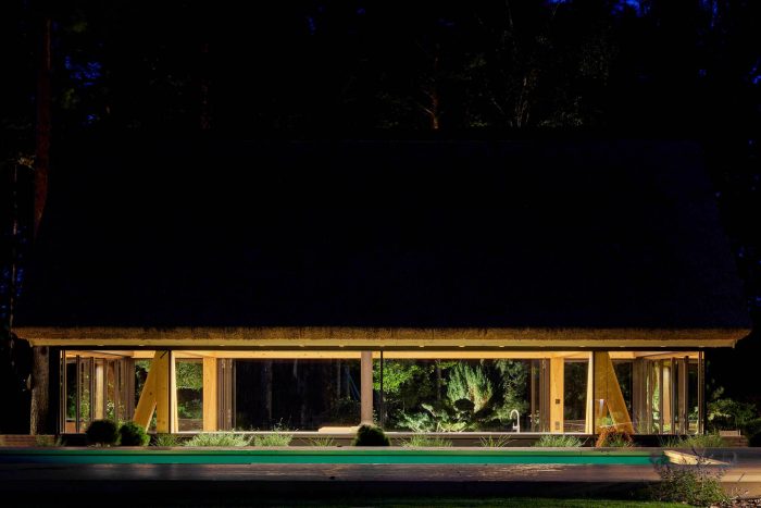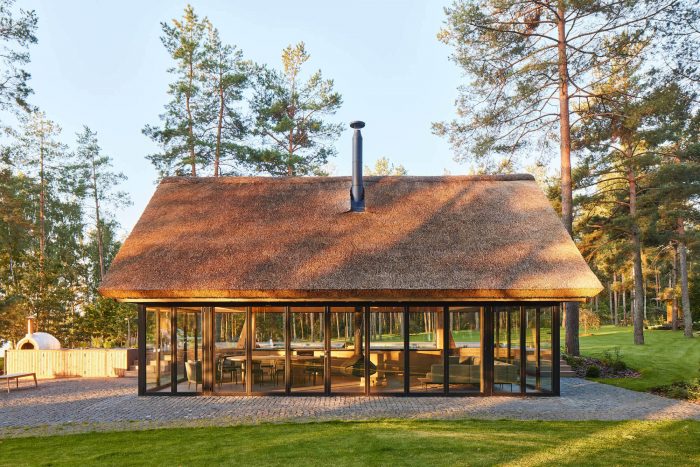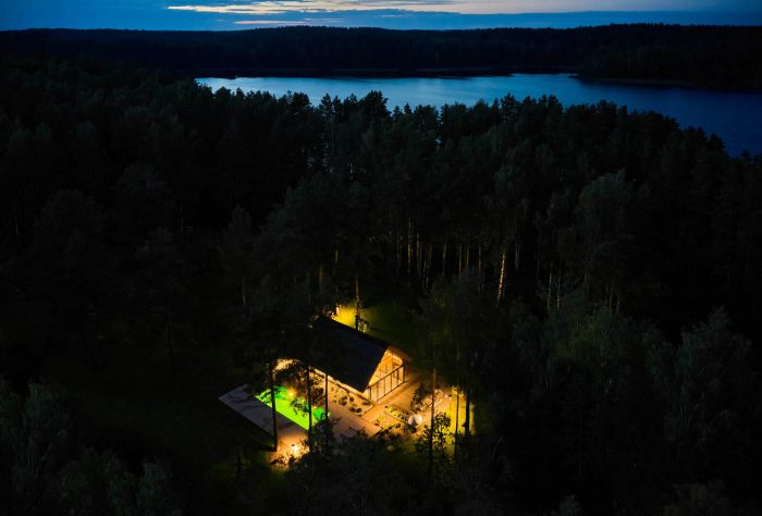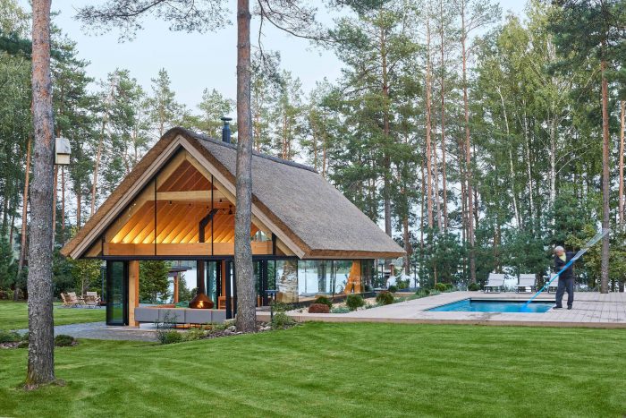 Surrounded by forest, a pool house is built near the lake. It complements the existing complex of several houses. The surrounding landscape clearly dictates the architectural form of the Lithuanian rural hut. The archetypal double sloped roof acts as an interior element and contrasts with the large windows that create a sense of transparency. The compact rectangular perimeter blends naturally into the landscape, respecting the surrounding environment.