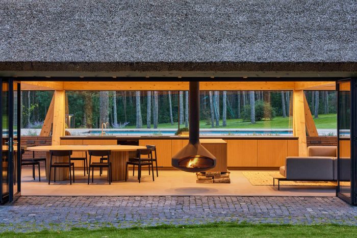 The grey-brown color palette of the building follows the “no-boundary with nature” idea. Internal spaces contrasting with the modest external shapes are revealed through a modern interior that follows the same color-material motif. On the one hand, the close-to-the-nature wood theme and large wide-opening windows let the line between outside and inside fade, on the other – creates a glassy, weightlessness, open feeling that is more common to modern interiors. Glass partitions are also useful during seasonal changes. People can enjoy using the pool house all year round.
