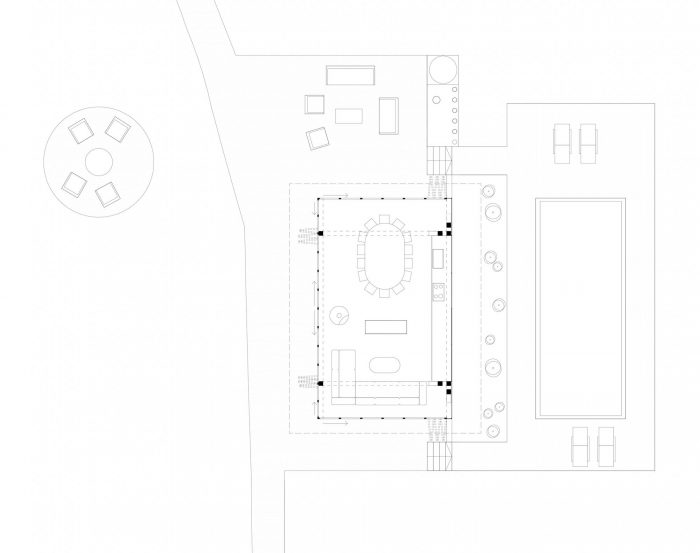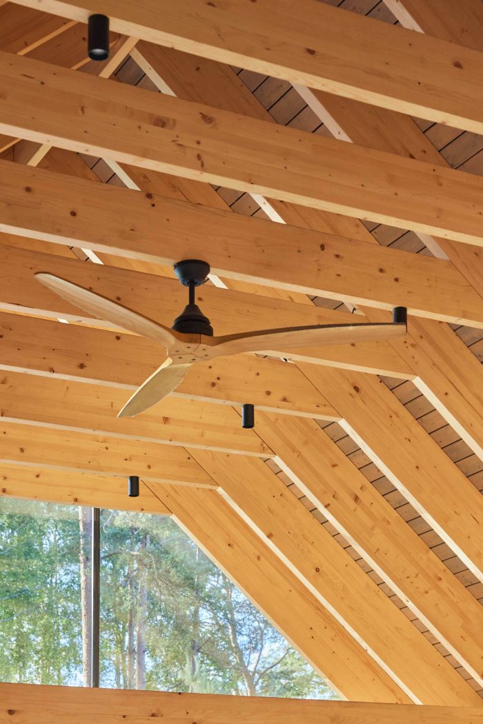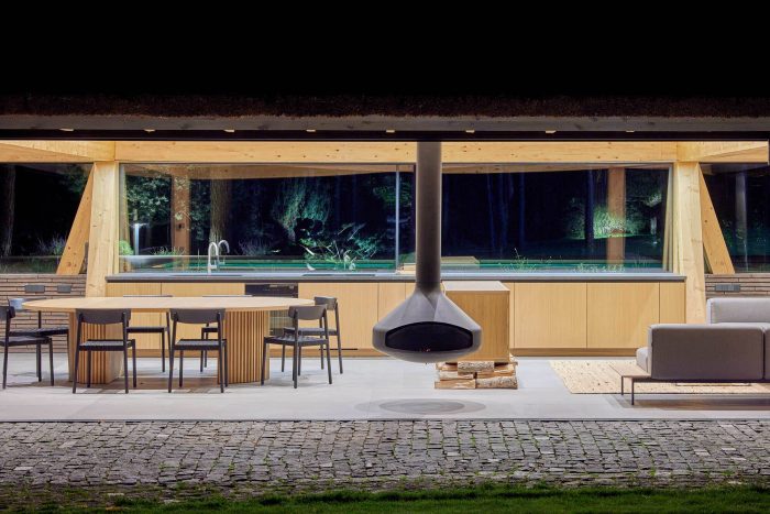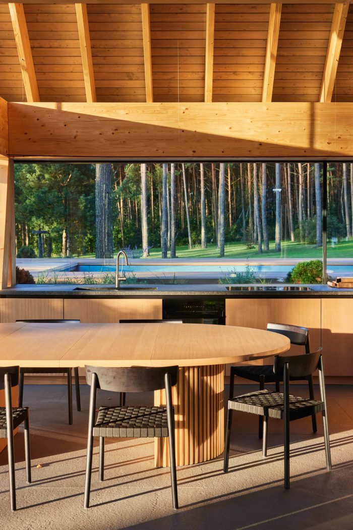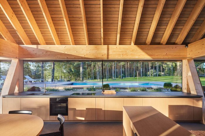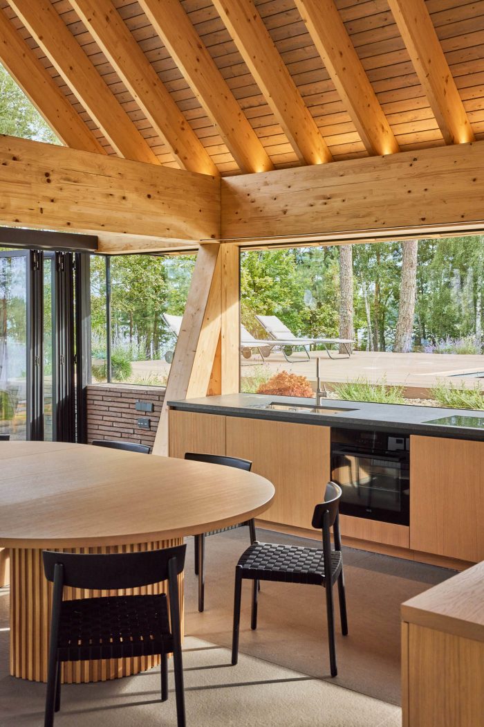 One of the most unique elements of the pool house is the exposed wooden structure, which dominates the interior space. Massive tripod columns, 60-centimeter height beams, and repetitive roof trusses not only create an atmosphere for the inside but also remind of ethnic Lithuanian house building tradition. The adjacent swimming pool complements the construction of the house. The higher poolside horizon line creates an empty space feeling as none of the furniture elements can be seen while swimming.
