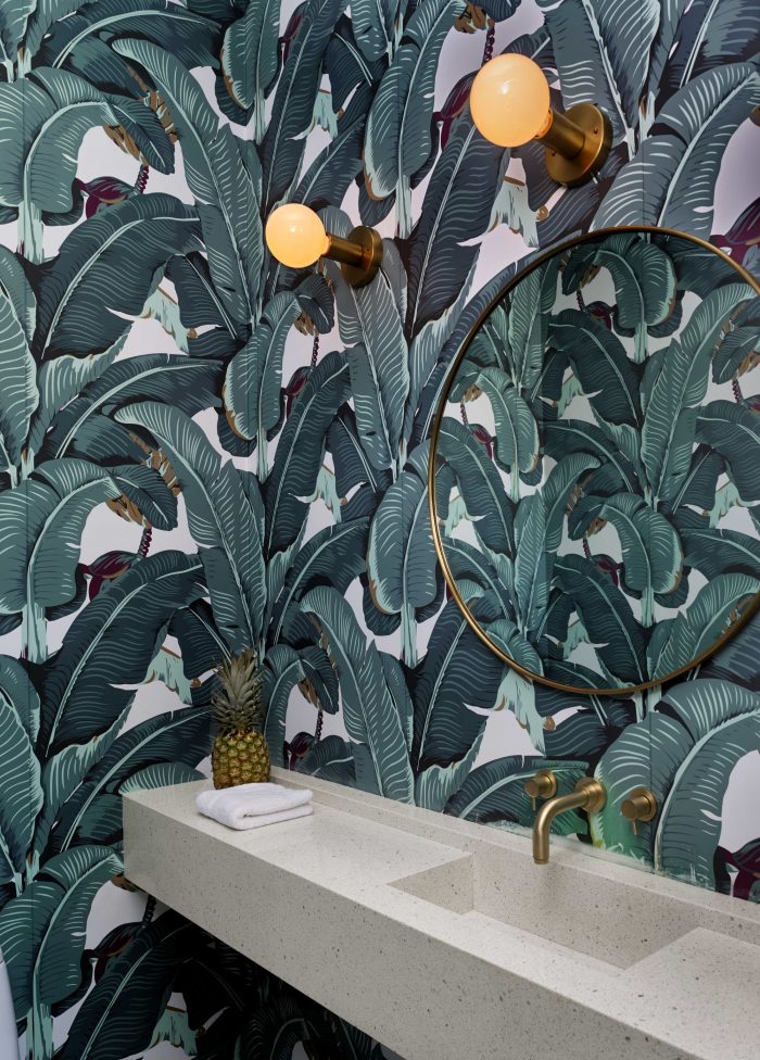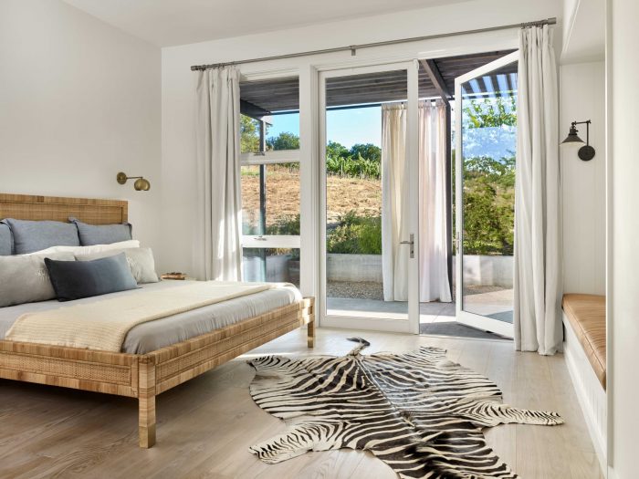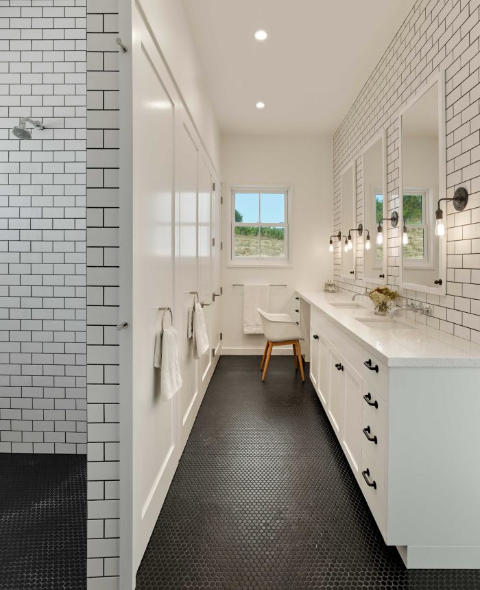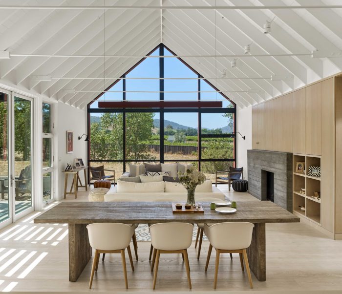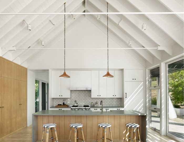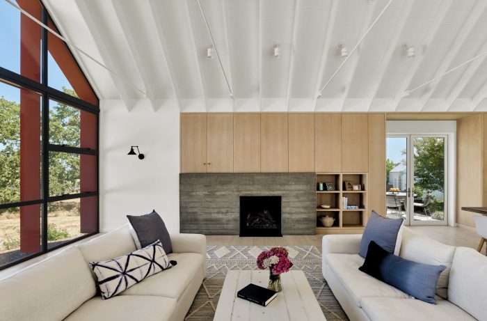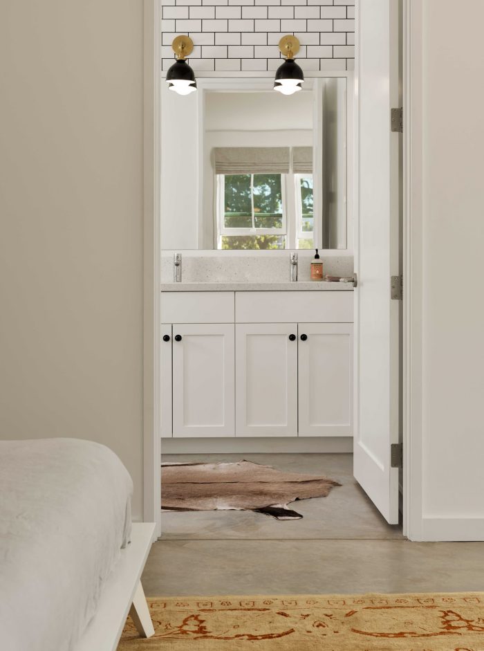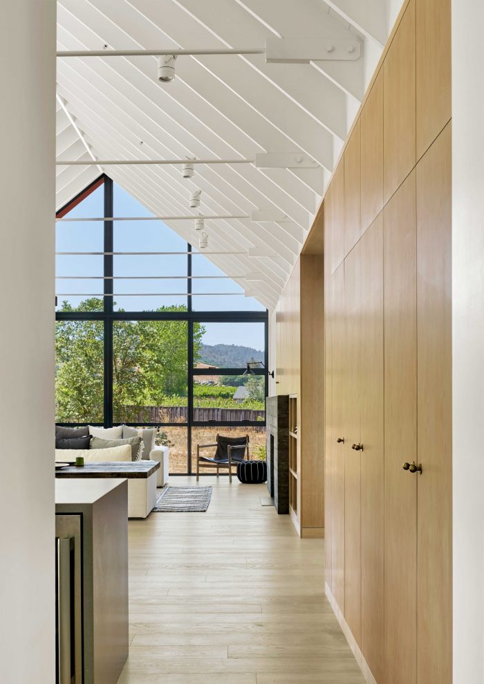 Main living spaces were minimally rendered with exposed ceiling structure, steel tie rods, gypsum board walls, custom wood cabinetry, and wood and concrete floors. Alluding to the project’s modernist leanings, the free-plan nature of the main living space contrasted spatially by the more cellular makeup of the family living areas.