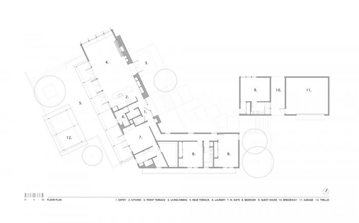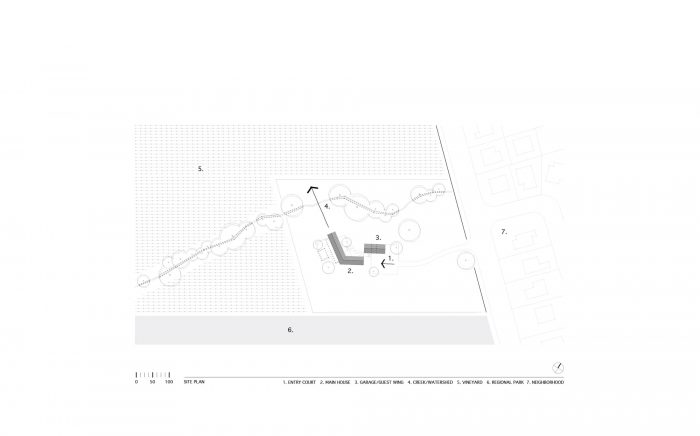 To engage the sloping topography and to create a sense of “place”, this 3,400sf residence was pulled apart into two wings that create a central garden space that orients one to the entry of the main house. The village-like feel of the composition establishes a sense of place on the relatively featureless site.