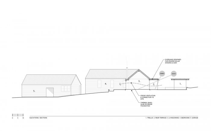 客户要求住宅对环境负责,便于维护,并能防火。为此,被动式太阳能策略、可持续收获的木材、复合护墙板、金属屋顶、钢材、木制门窗和板状混凝土都是项目的组成部分。