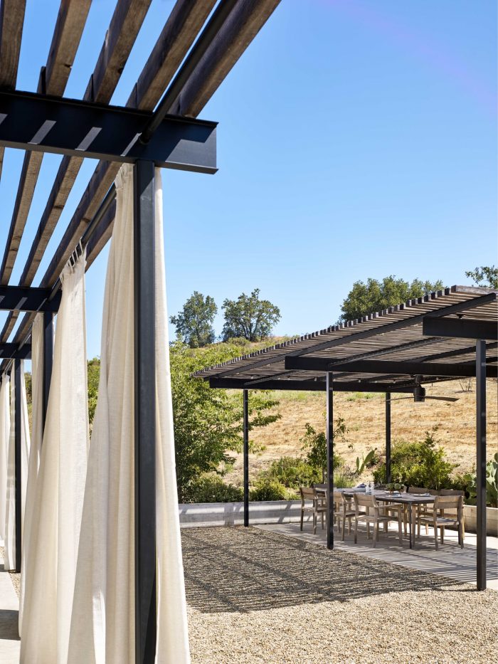 Simple iconic metal-roofed elements clad in fire-proof siding are elevated at the entry by a stained cedar feature - adding to the animated nature of the composition is the primary North view elevation clad in a steel sunshade and steel window wall. Steel and wood trellises and arcades help to shelter the house from the hot summer sun and are designed to allow the low winter sun to penetrate deep into the living spaces.