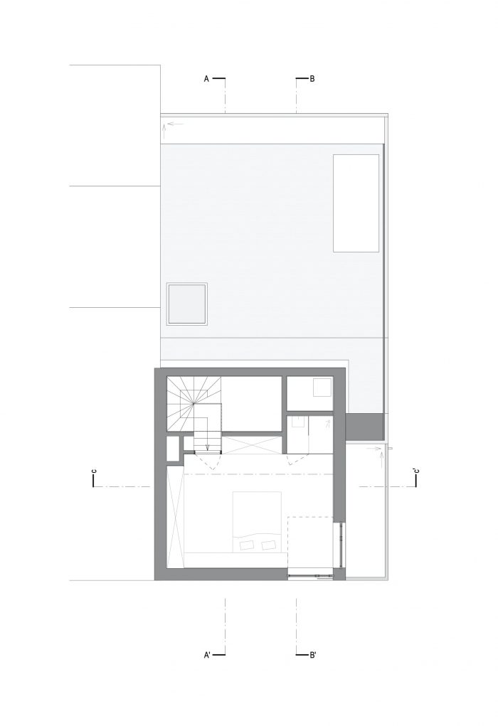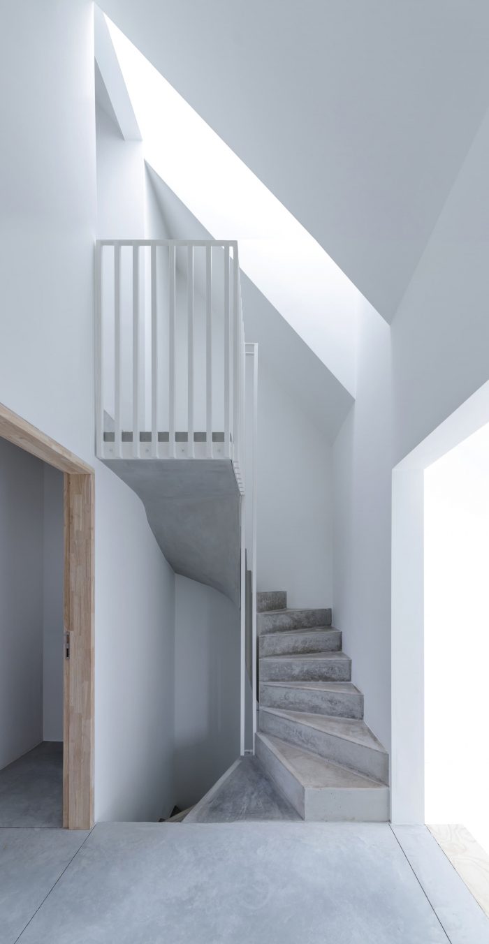 The chimney-shape is used to provide a skylight. Because of the orientation, the living space is designed as the sun through. At the frontside, the kitchen is placed with a "porch".