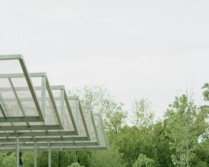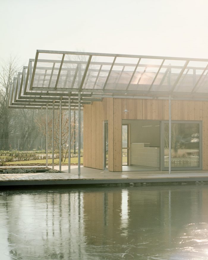 The pavilion found its place on a lightweight pier reaching into the lake. The sawtooth pergola and the compact wooden cafe house underneath it lends the pavilion a distinctive character, setting it apart from its more robust surroundings.