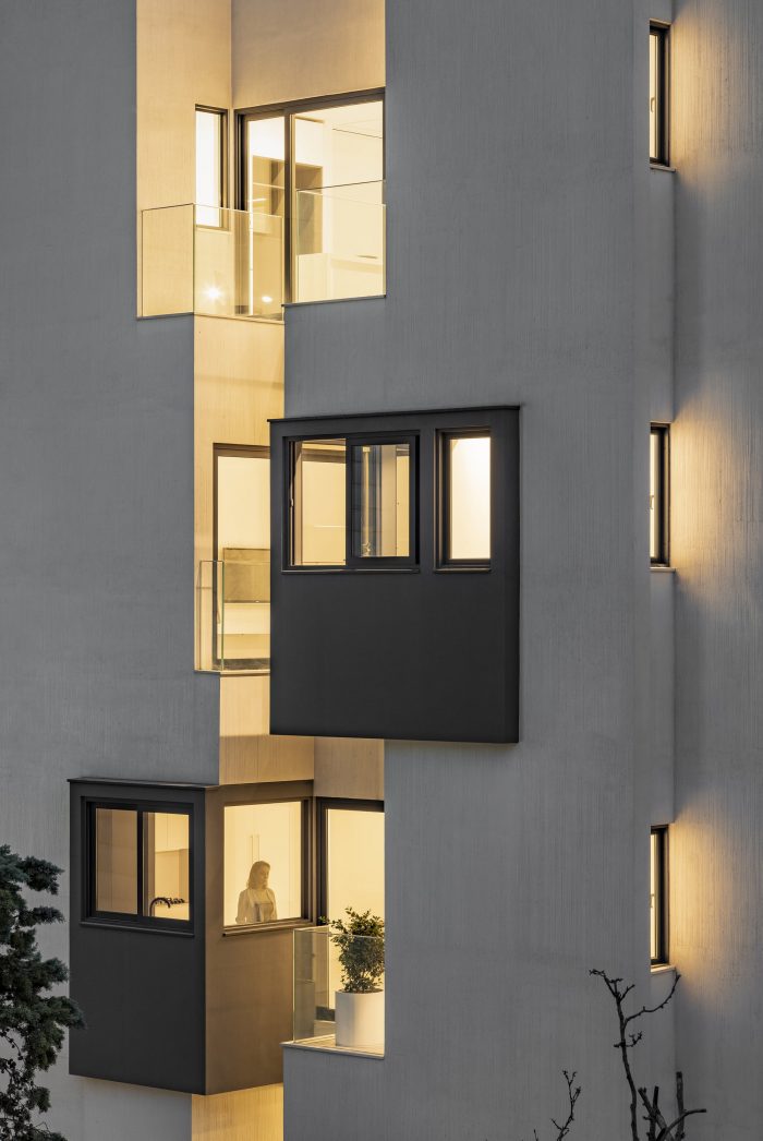 每个单元都围绕着一个亲密的阳台,这被视为一个室内花园。这里有一个材料的安排,以及饰面和纹理的层次,这是对与工匠合作的价值的赞扬。这在外墙的梳状水平水泥图案中很明显,它也是雨水的导体,保持建筑表皮的清洁。门把手、栏杆、照明设备和橱柜都被巧妙地整合到建筑的细节中。在这个项目中与不同背景的制作人合作,提醒人们建筑是强烈参与和时间的产物。