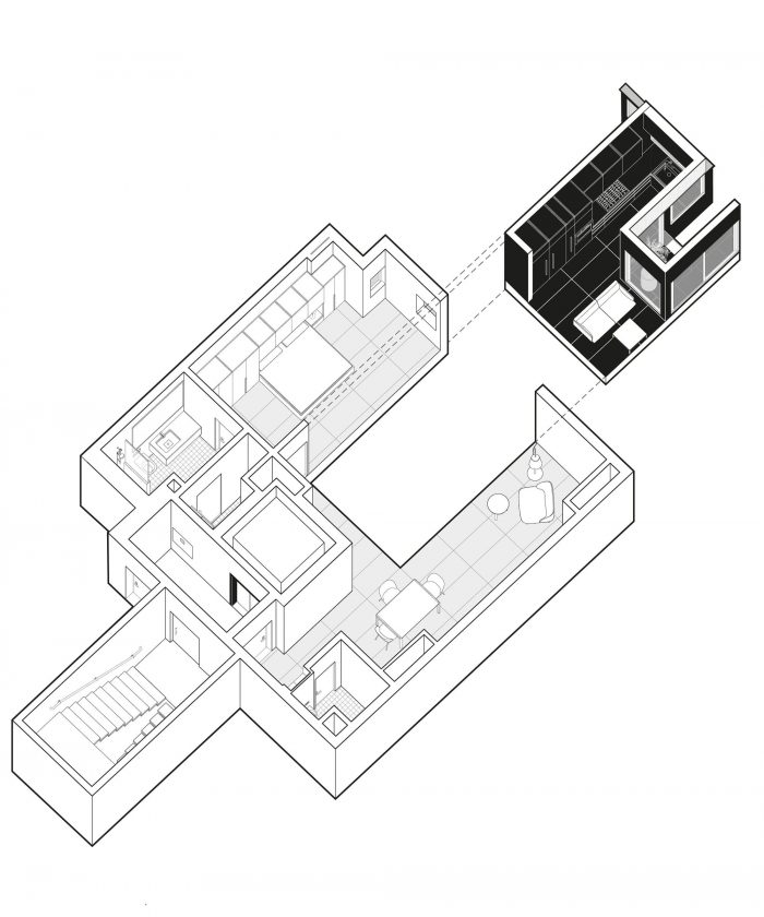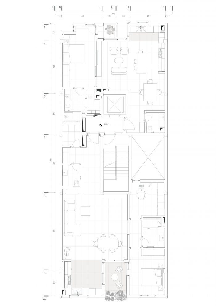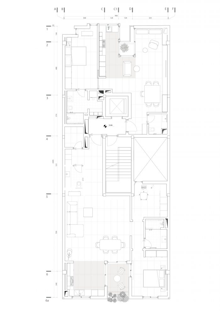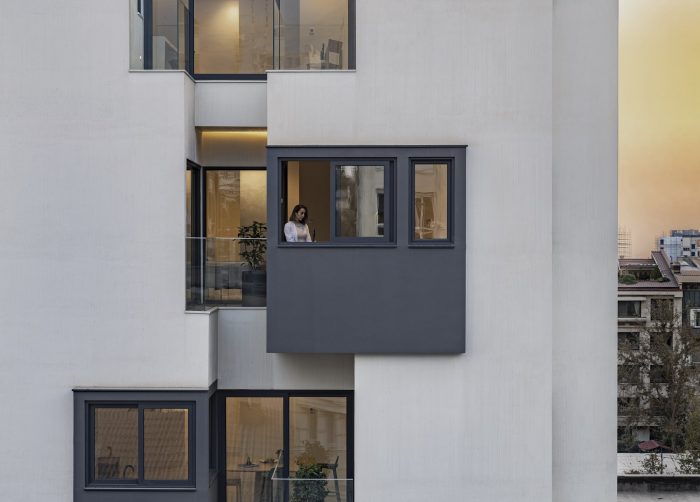 The aim here is to redefine the building’s territory and to assimilate a single-family house that expands into its surroundings without the interference of rigid borders. The interior layouts of the building reveal a deep structural and volumetric connection to the façade; a vocabulary that is used throughout the project. The juxtaposed volumes of the void offer playfulness through shifting perspectives and views, allowing the interior and exterior boundaries to be experienced simultaneously. The Hide-and-seek between inside and outside takes place through the interplay of solid and void, challenging notions of exposure and privacy. There are two units on each floor; making noise and privacy driving forces in the positioning of a rectangular stairwell, which acts as a buffer to prevent sound and direct visual contact between the units.