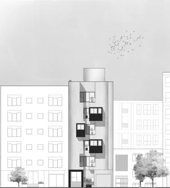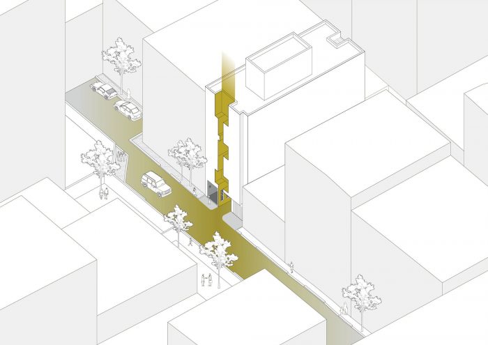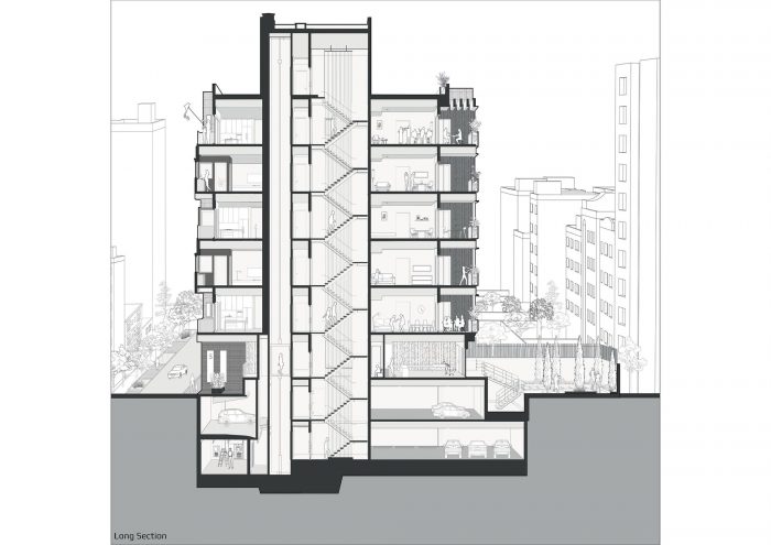 VOID+ is the first residential scheme by Maryam Pousti. It tries to offer an alternative to conventional models of habitation and dense urban living which has resulted in closed-up building envelopes that lack a dialogue with their context. Situated on an extremely narrow site, VOID+ consists of 10 units on 5 Floors. The striking feature of the project is an intimate void strategically carved into the north façade in an attempt to engage the building with its periphery. The massing of the void creates a vertical flow between the skyline of the building and its feet. The main entrance is defined by the particular moment when the verticality of the void turns into a horizontal plane that is stretched 20 meters along the length of the building. This horizontal platform connects the street level to the back garden, allowing for communal activities in the neighborhood.