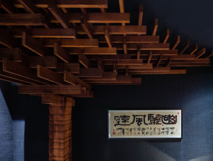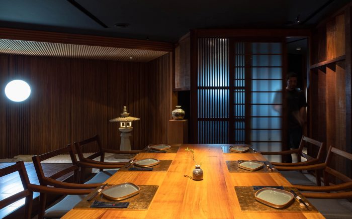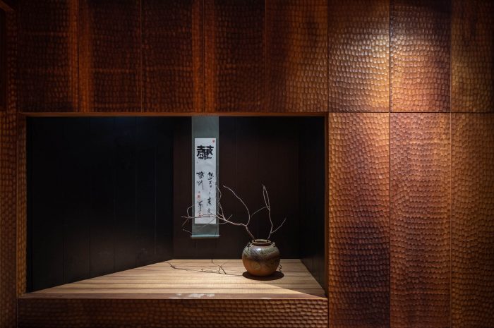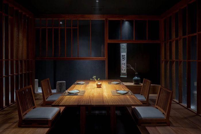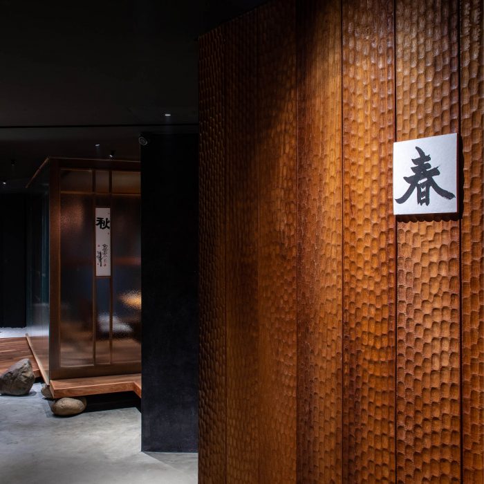 The design of the restaurant draws inspiration from the Japanese tea room and the spirit of the tea ceremony. Dining spaces are enclosed and divided into small rooms, each is carefully designed in reference to the modesty of the tea room to highlight the spirit of hospitality. At Wabi, hiding in every corner is a carefully placed detail waiting to be found by one’s wandering eye, whether it be a piece of finely hand-chiseled timber or a rugged rock sculpture. Each find is a peculiar experience that becomes an intimate memory.