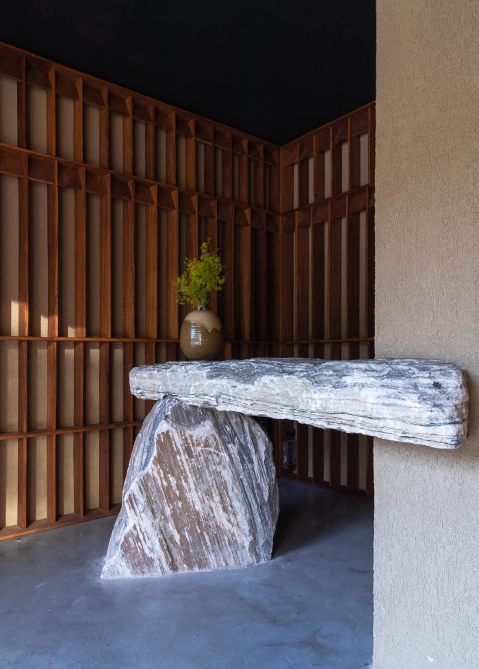 餐厅的设计从日本茶室和茶道精神中获得了灵感。餐饮空间是封闭的,被划分为小房间,每个房间都是参照茶室的谦虚而精心设计的,以突出好客的精神。在Wabi,每个角落都隐藏着一个精心布置的细节,等待着人们游移的目光去发现,无论是一块精细的手凿木材还是一个粗犷的岩石雕塑。每一个发现都是一种奇特的体验,成为一种亲密的记忆。