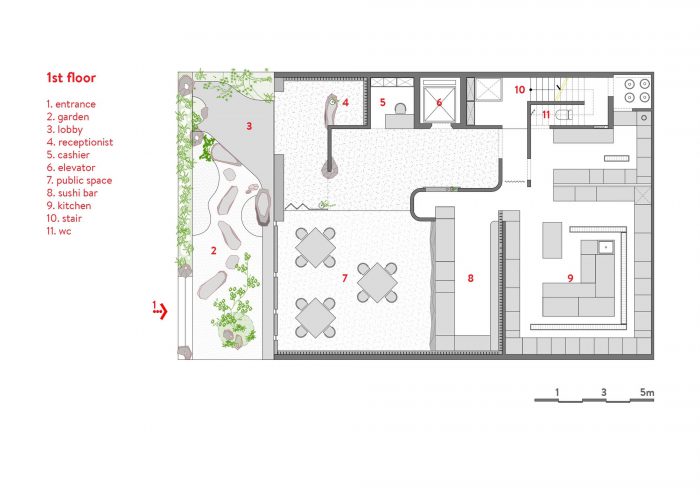 Learning from the Japanese wood-working techniques, the surface of the table, the door frame, and the wooden floor inside the restaurant take their shape through the hands of Vietnamese carpenters, charmingly connecting the two cultures. The foreign becomes familiar. The bizarre carving on the wood becomes native to one’s touch. The palms speak to the mind what the eyes can’t see at first glance.