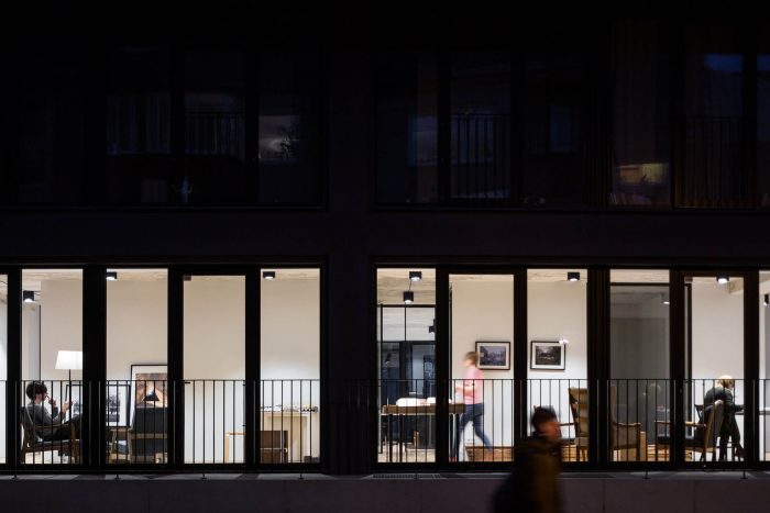 建筑物本身适应了内部的现代需求:第一层住宅是为小而实用的城市工作室设计的,入口在露台上,可以看到两边的风景,第二层的居民住在阁楼式的公寓里,有高高的天花板,小天井和屋顶的露台。在外观上,更新的玻璃外墙和精致的木质大门装饰成为背景地标。