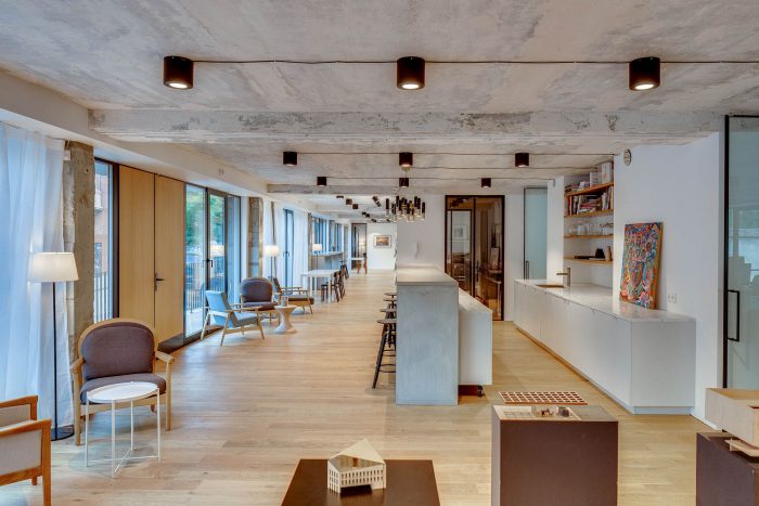 This warehouse conversion preserved the best features of an existing building and connected them with modern solutions. Through the renewed glass façade, the daily life of the architects’ office may be observed – talks in the kitchen, creative meetings, lectures, and weekly events. Along with table tennis, the sauna is implemented in the office interior. It is visible from the street and, in the evening, it becomes a lovely surprise for the passers-by. On the other half of the floor, an open-plan workspace with a huge terrace allows you to freely communicate with your team, share the knowledge and feel the pulse of the office.