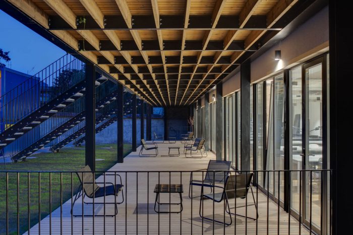 The building itself is adapted for a contemporary need inside: the first residential floor is designed for the small but functional city studios with entrance from the terraces and view from both sides, the residents of the second floor live in loft-type apartments with high ceilings, small patios, and roof terraces. In the exterior, the renewed glass facade and sophisticated wooden finishing of the gates become the contextual landmark.