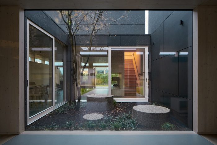 The whole process of construction ran smoothly by using our modular concept from Ark-shelters, but this time from uniform modules of 4 x 6 meters which together created a strict and rational grid. However, from the patient's point of view, its movement is fluid and organic. The overall movement in the building oscillates between two translucent atriums, which were created by omitting the internal modules of this twelve-position grid. Subsequently, we moved these two modules to a higher level, which achieves a new level of intimacy and the dialogue remains only between the patient and the doctor, under the open sky.