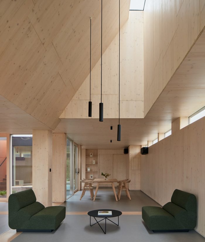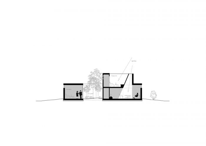 The group therapy room is open and adjustable, from group sessions on the floor to more formal settings, this room can be used entirely based on the required setting. In all terms, showered with light, this room has a sunroof to make the space feel open and make it easier for people to connect. The terrace is sheltered with a wall of wood in the language of the building's protection from the wind or views. Providing safety and privacy or enjoying a moment of air, a breath, or peace.