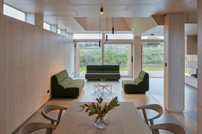 A soft ramp will guide you into the Centre, and a front door is set back from the facade to protect from wind, provide a safe entrance and remove the hospital look and feel. The building throughout can breathe and is penetrated by nature and views. Almost every seat has direct visual access to the outside. The windows on the top will ensure there is always gradual light throughout the building while providing privacy. A mixture of direct and indirect views will allow different individuals to find different comfortable nooks where they can be themselves.