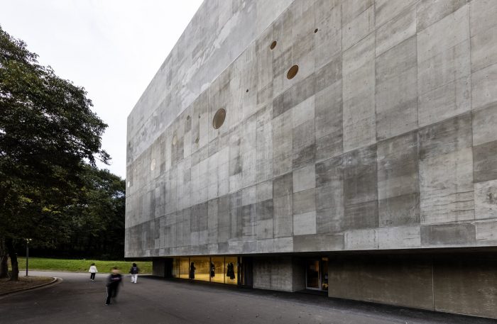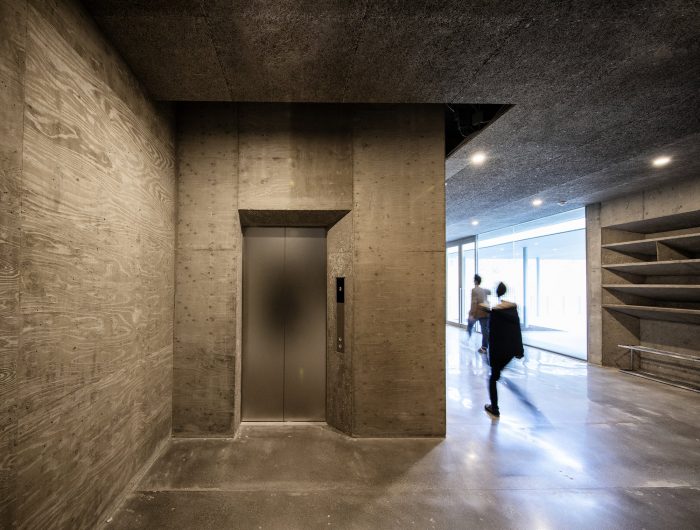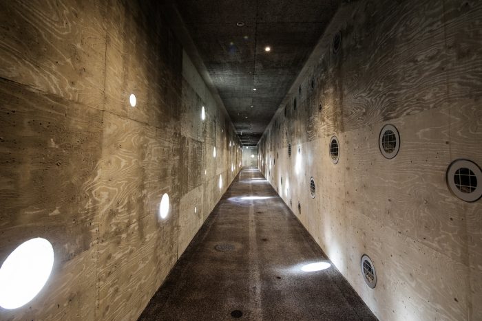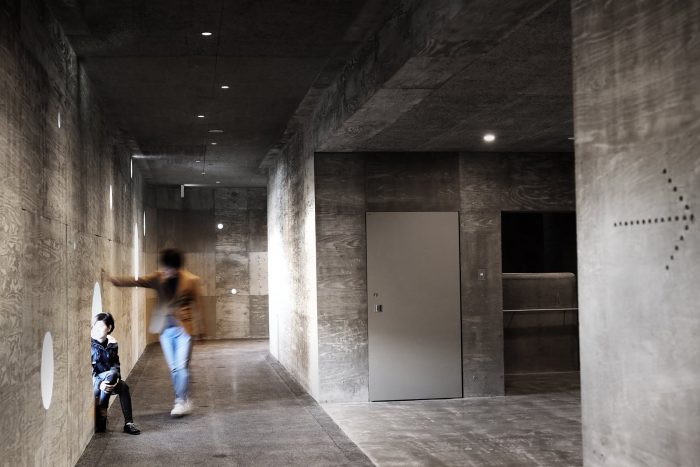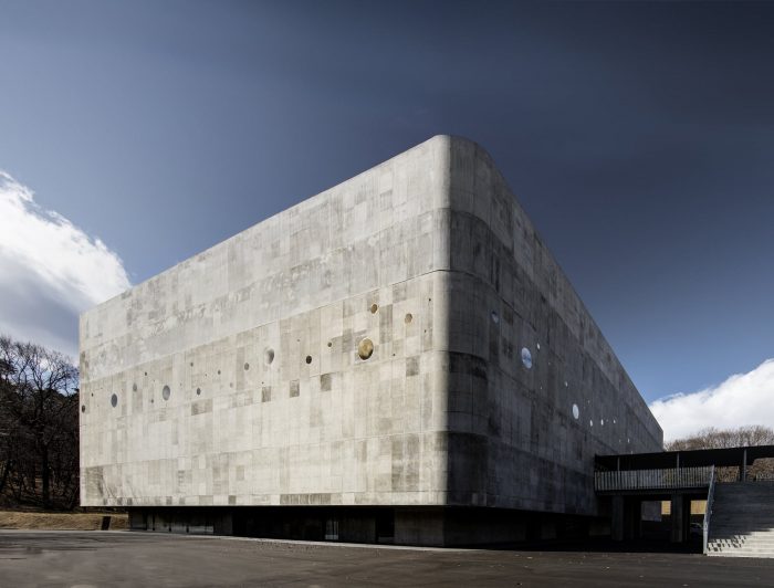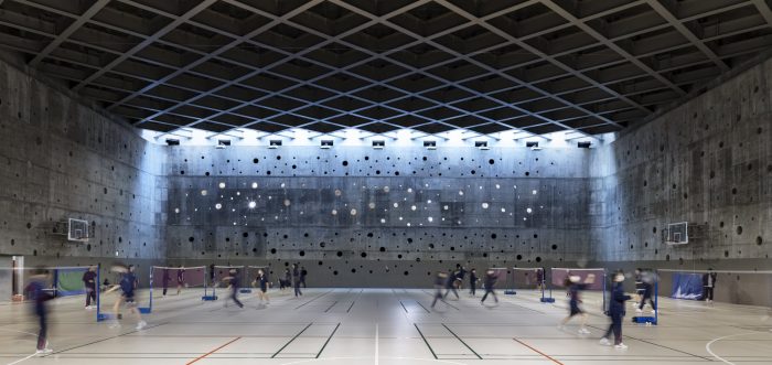 With small and large holes bored into the walls of the arena at strategic locations, natural daylight that penetrates the arena core is pale and dim, akin to the midnight sun. This orientation obviates the need for blackout curtains. The facility’s interior and exterior were both finished in fair-faced concrete. Ornamentation was kept to a minimum to clarify the composition of the building. The structural layout is akin to a temple; the intent of the spatial configuration was to create a place where users can learn the “essence” of things.