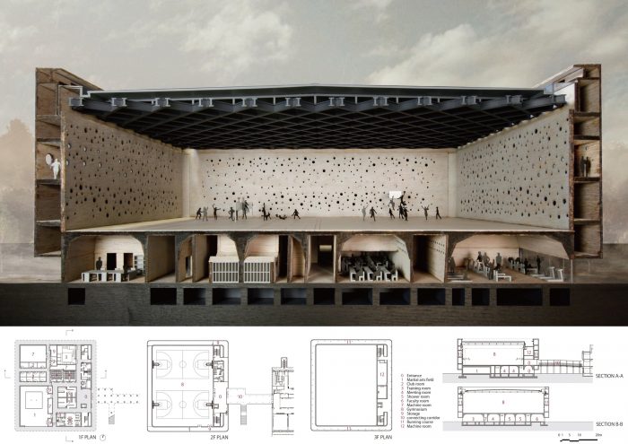 The gymnasium is designed to be an extension of every day; as students ascend the floors, their experience becomes gradually more extraordinary. However, the design intent is not that every day is “inverted” into the extraordinary, but rather into a more common, “every day” experience. When designing this gymnasium, our thoughts were on the idea of architectural expression that can be modern, but also “universal” in the sense that it can belong to any era.
