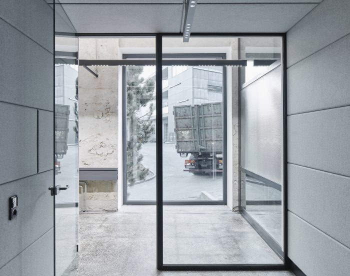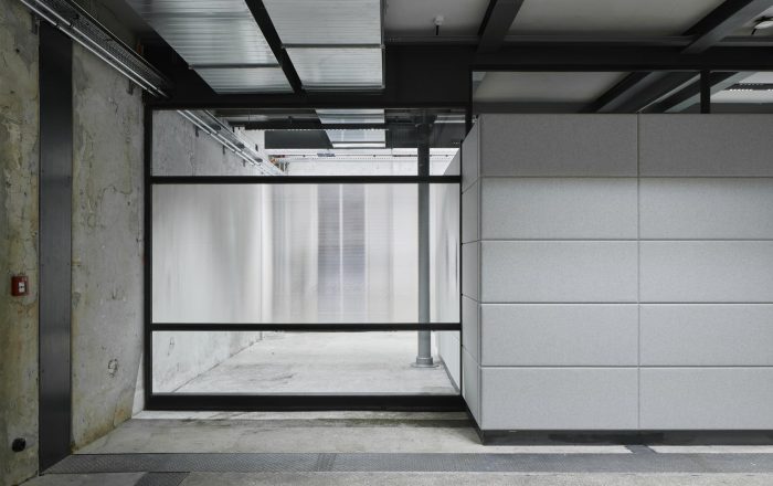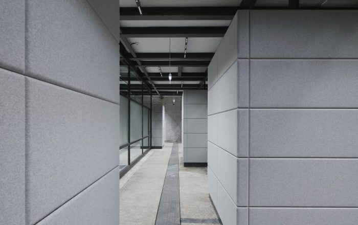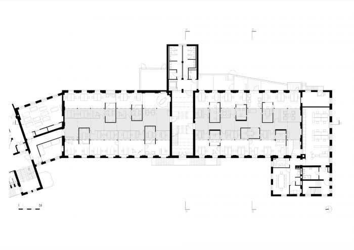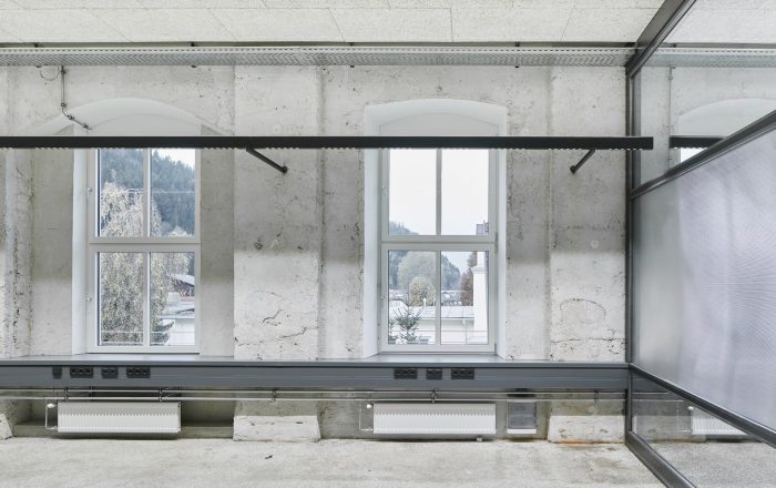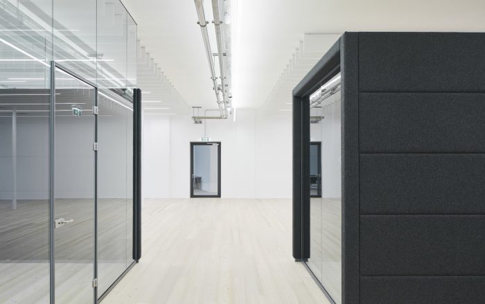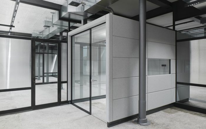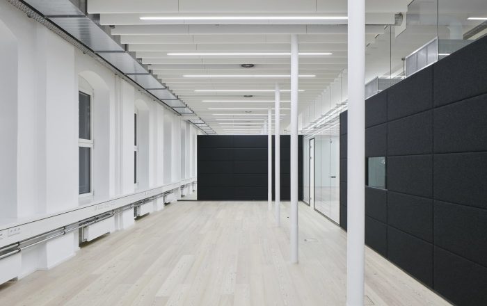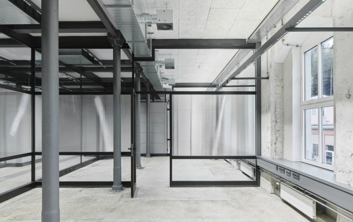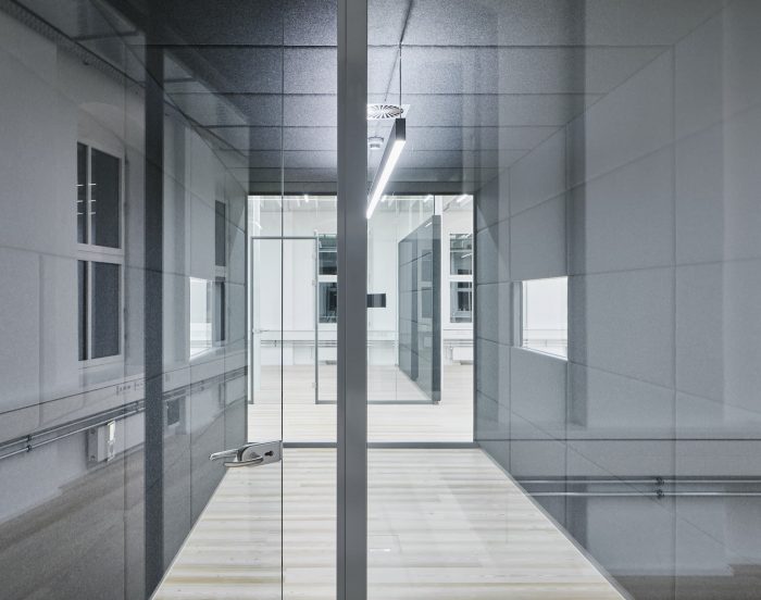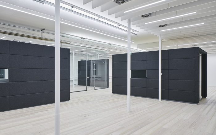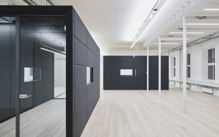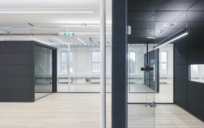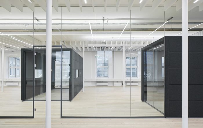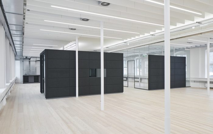 Building 6, Grinding Rooms. The re-conversion of building 6 was carried out with a similar approach as for the first re-conversion stage, by freeing the original large spaces and bringing them back to their original state. The new office units have been separated with glass walls, each office with a felt-cover box on both sides as a retreat area, improving room acoustics.