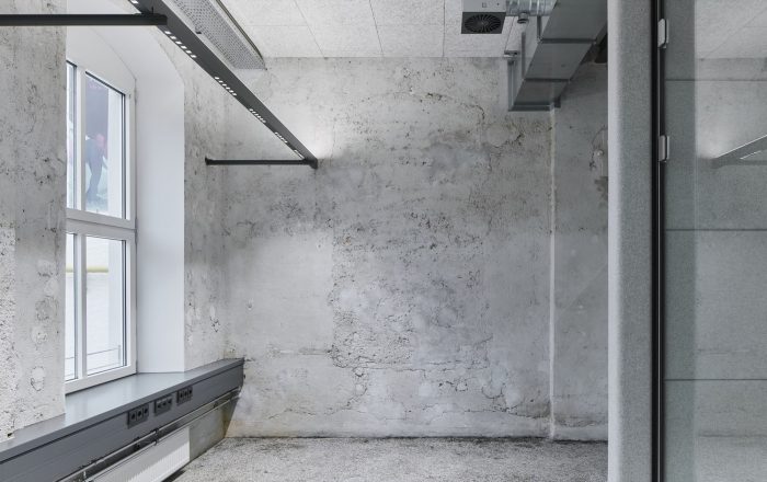 The grinding room on the 1st floor is divided into several office groups. The existing cast iron asphalt floor has been sanded, the cast-iron columns have been painted dark grey, the ceilings in light grey, walls have been milled.
