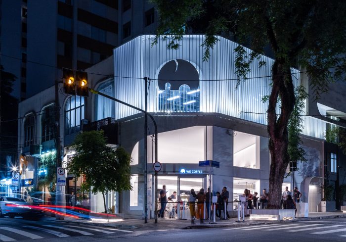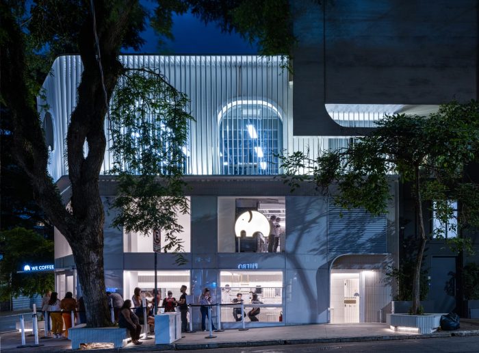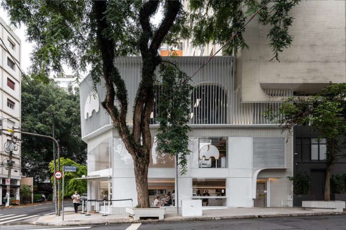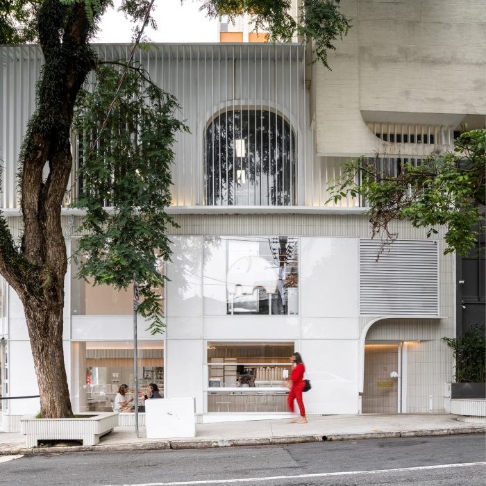 We also brought grandeur to the façade by designing vertical sunshades that help in the continuity of the visual language of the ground floor and mezzanine, ensuring greater prominence for the cafeteria on the corner of Alameda Lorena and Haddock Lobo.