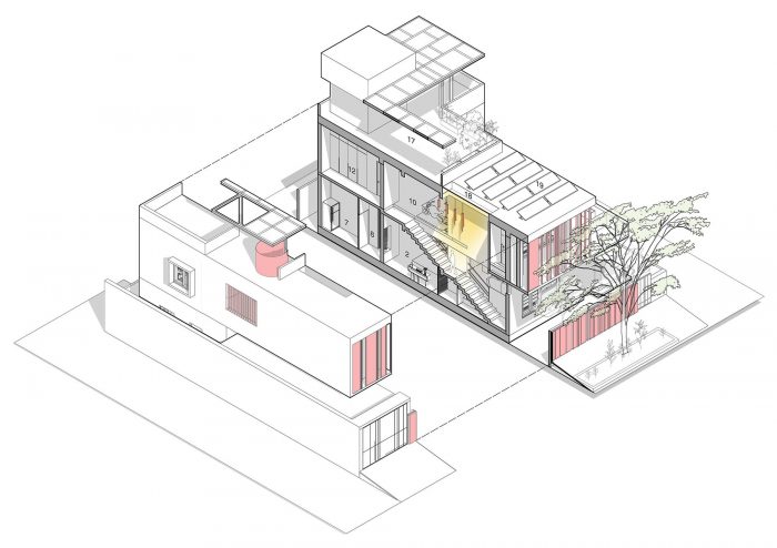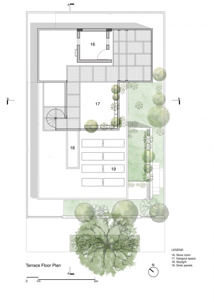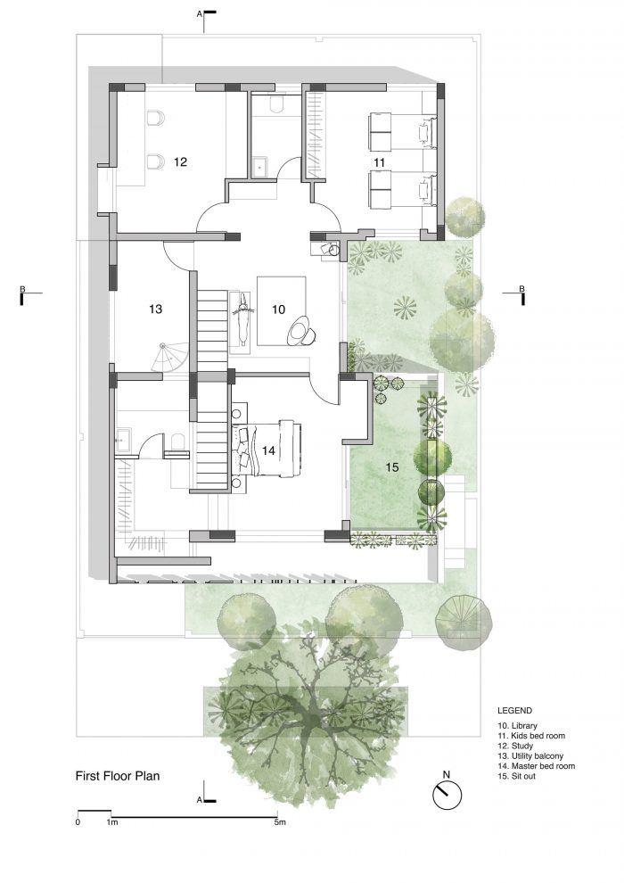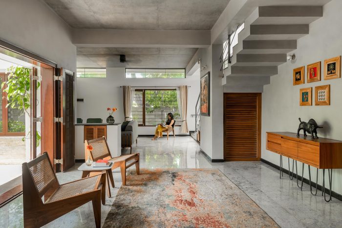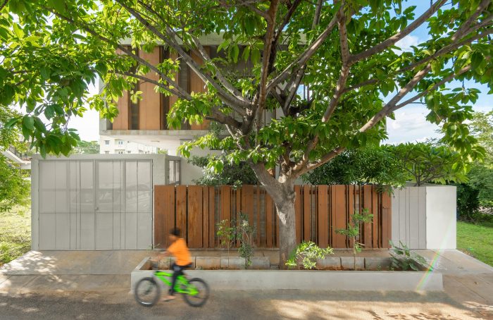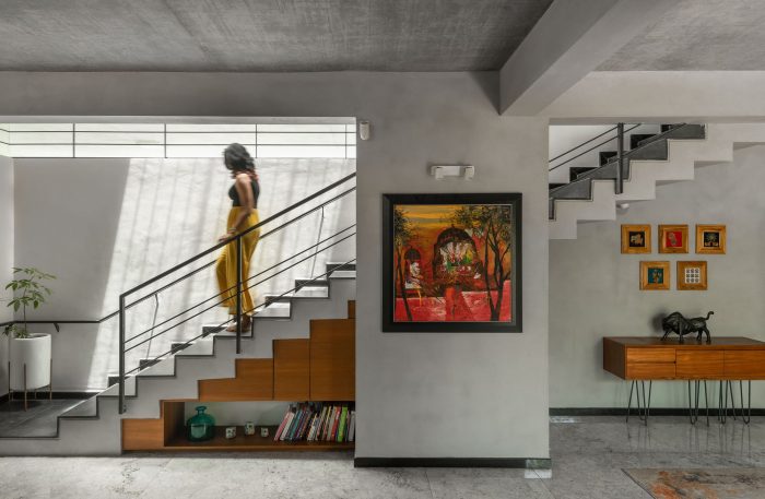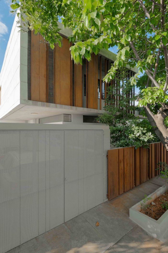 The southern facade in the front is an expression of layering in materials of differing perforations and textures – also guided by the sun’s penetrative rays. The leafy monster in front of the house became a partner in the act of layering. The sun is finally allowed to bring its drama into the house by way of the top-lit main stair.