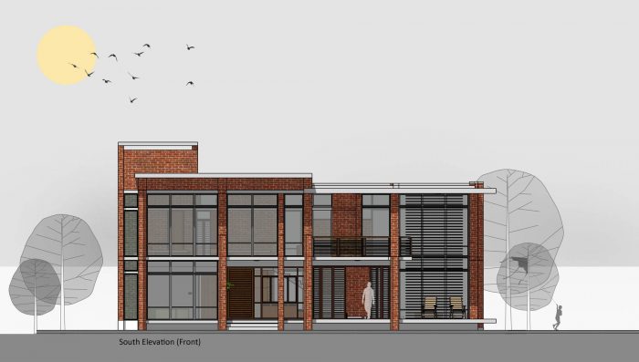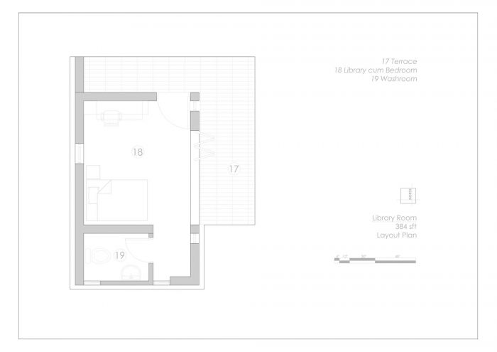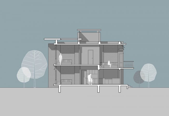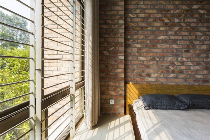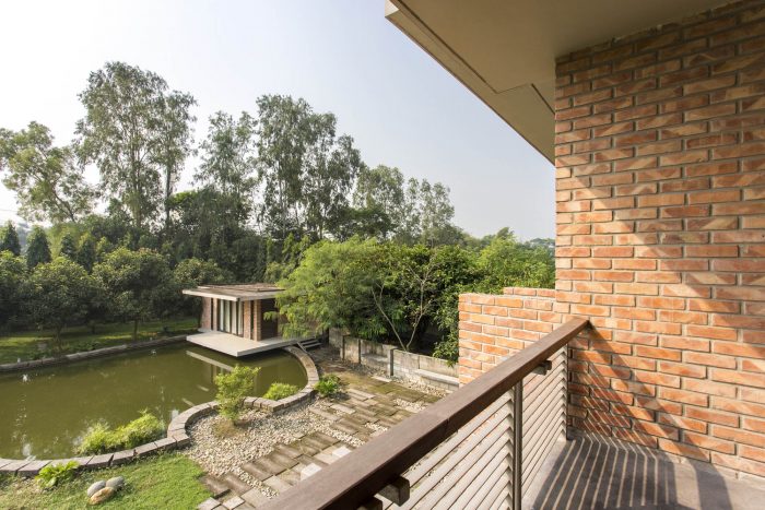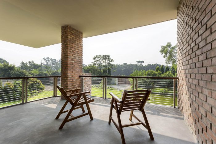 The building is placed in east-west orientation, which allows maximum breeze to get in from the South and reduces the solar heat gain. However, this orientation exposes the building to the south sun and driving monsoon rain. Balconies and verandas play a pivotal role here to create the buffer from outdoor to indoor. They protect the indoor living space from direct sun and rain. Such semi-outdoor spaces of different forms are fundamental in warm, humid regions in terms of comfort and creating a dialogue between the indoor and outdoor environment. Balconies and verandas at different levels provide different spatial experiences by connecting to the surrounding rustic environment within and beyond the surrounding paddy field.