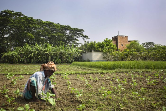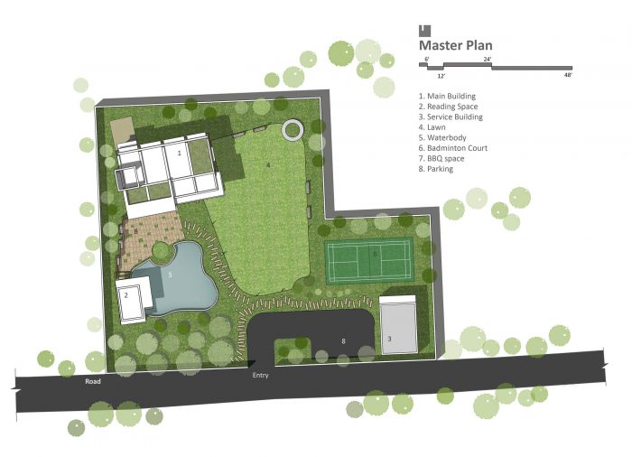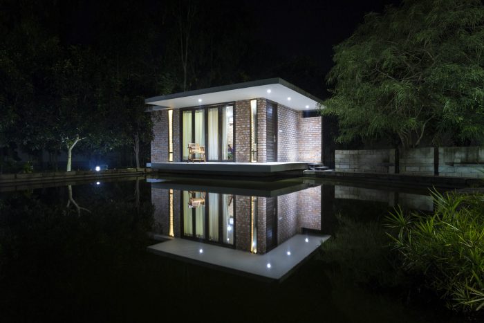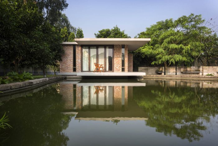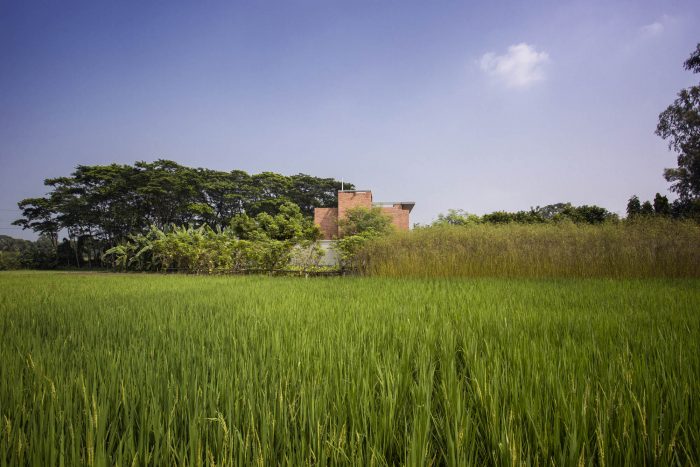 Traditionally, the “Kachari Ghar” concept was a widespread practice in the rural architecture of Bangladesh. This project carries that idea in the form of a library. This single room which serves as a study room with book storage, seemingly floats over the designed water body, creating a sense of tranquility in and around the place. The landscape has been recreated with locally-sourced common trees and plants, which has been selected as a subtle blend of the local environment.