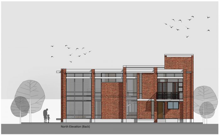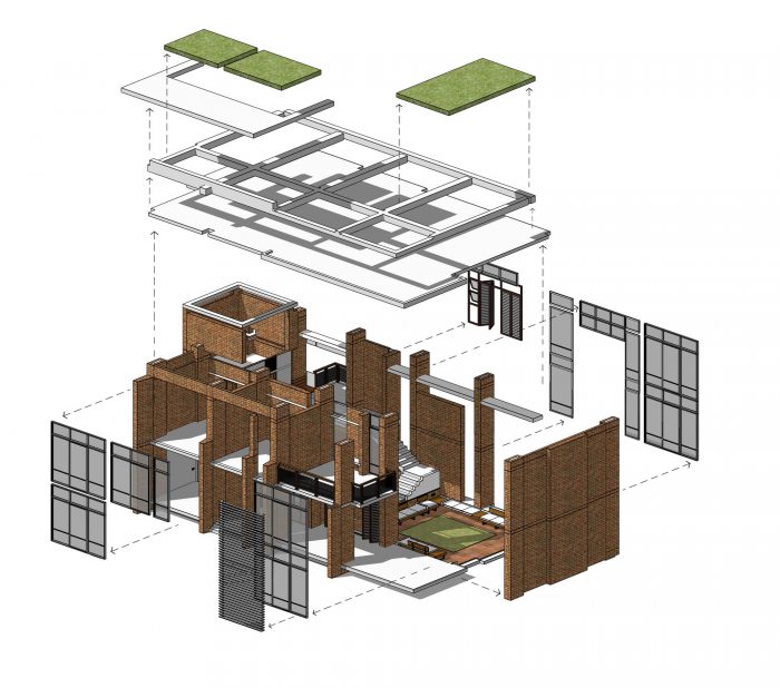 The prime building material is gas-burnt brick which is sourced locally. Exposed brick has been used to evoke a robust tactile feeling. Local woods are used for the furniture and door windows. In order to minimize material waste, leftover broken bricks have been used as brick chips in casting work for landscape pavement blocks in the site. The main structural system is a column-beam frame with supporting load-bearing walls. To preserve the true expression of brick throughout, a composite column has been designed with RCC surrounded by one layer of bricks. Inverted beams support the roof, and its benefit is twofold. Firstly, it gives a beam-free clean ceiling, especially in the interior double-height space. Secondly, the inverted beam on the roof helps to retain filled earth for rooftop green and planting.