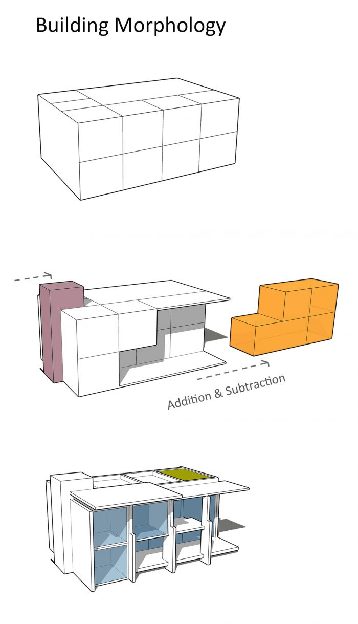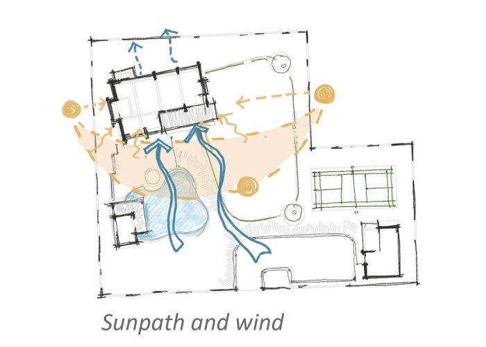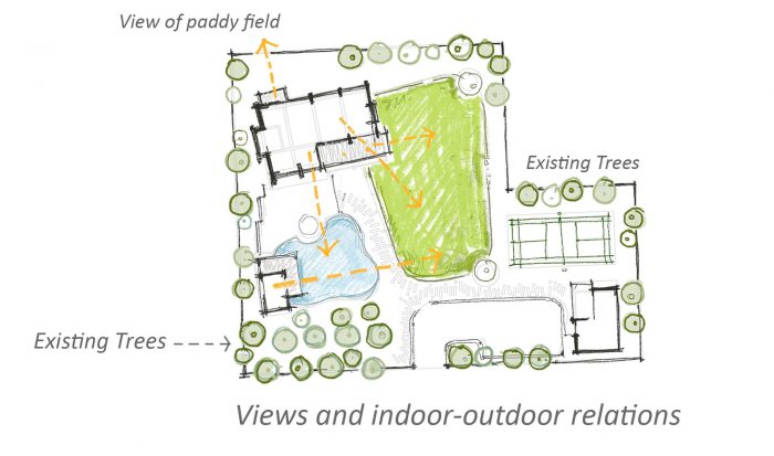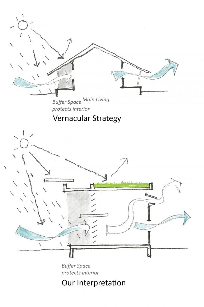 建筑物被放置在东西方向,这使得最大限度的微风从南方进入,并减少太阳热量的摄入。然而,这种朝向使建筑暴露在南面的阳光和季风雨中。阳台和走廊在这里发挥了关键作用,创造了从室外到室内的缓冲区。它们保护室内生活空间免受阳光和雨水的直接照射。在温暖潮湿的地区,这种不同形式的半户外空间对于舒适度和创造室内外环境之间的对话来说是至关重要的。不同层次的阳台和游廊通过连接周围稻田内外的乡村环境,提供不同的空间体验。