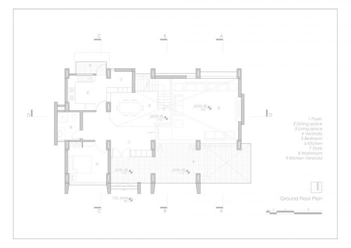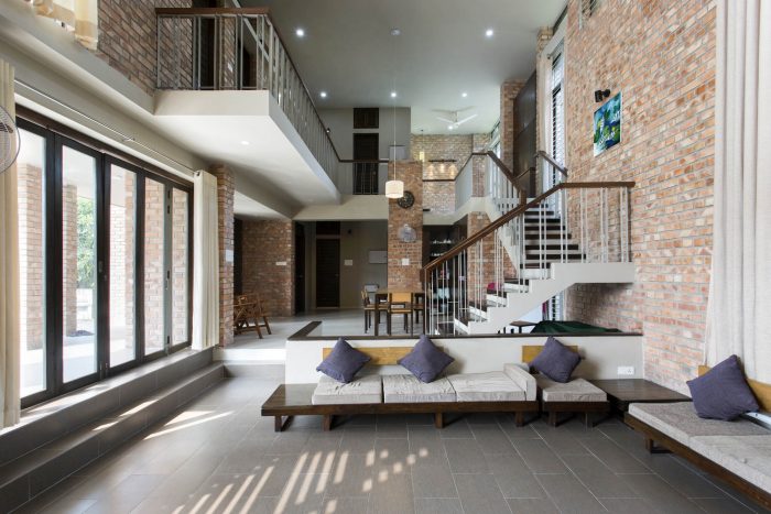 Local rural people were given priority in the procurement process of materials and workforce. Inexperienced local workers have been trained to work precisely with materials. During construction, this prioritization helped the poor people of the locality to earn money and get trained, which helped to reduce project costs of supply and transportation significantly. The design of this weekend house intends to respond to nature by embracing it, becoming part of the landscape through its expression, and evoking a sense of belonging to its occupants. The architectural abstraction, formal expression, and spatial experiences are strongly driven by the regional context, culture, and vernacular strategies.