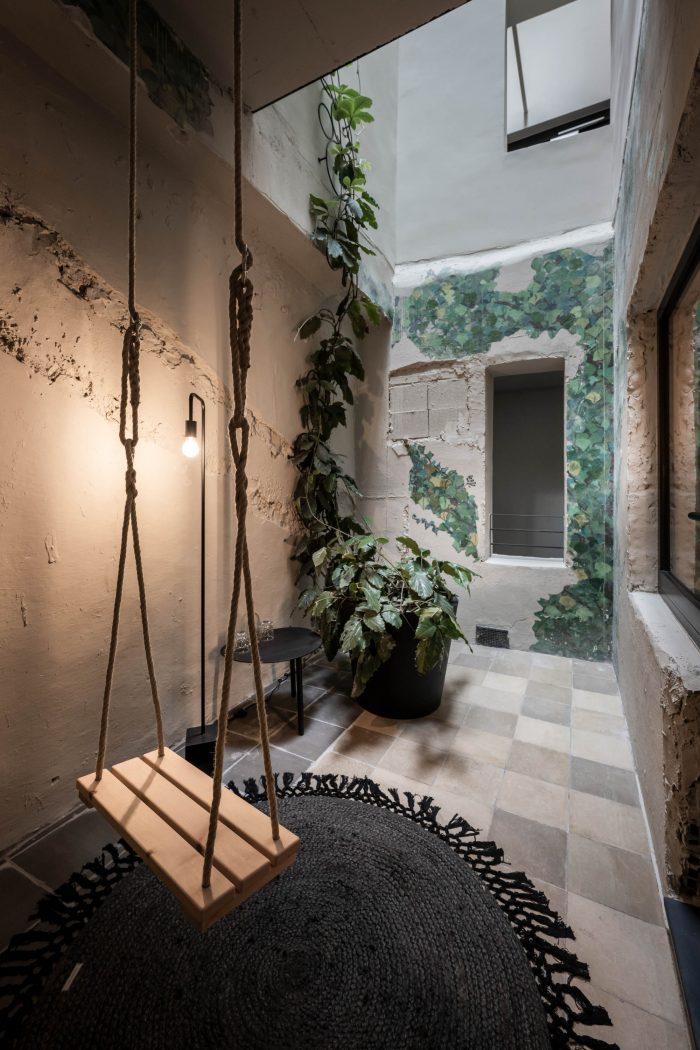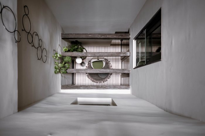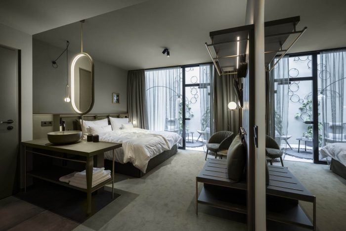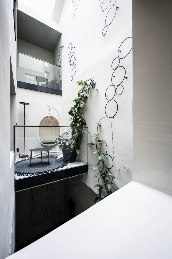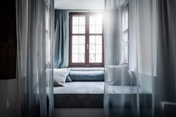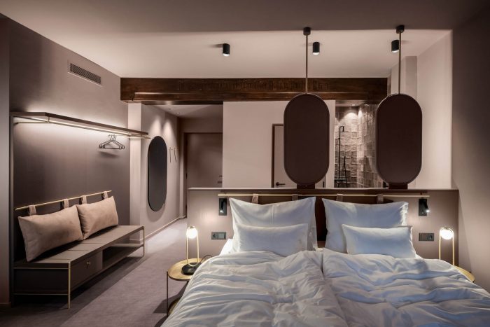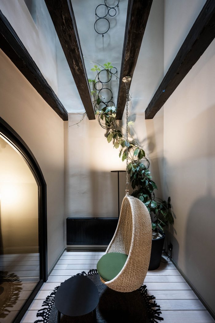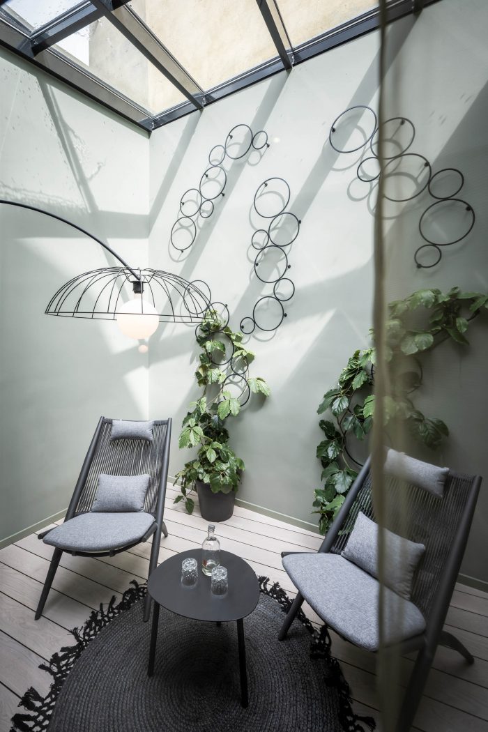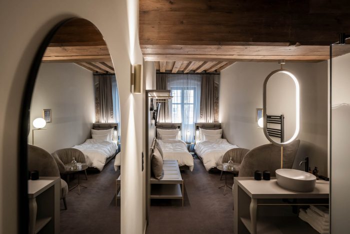 Off to the bedroom. The new rooms and suites – or “chambers”, as the owners affectionately call them – are located on the floors below. Despite the architectural irregularity of these existing floors, with their gothic ceilings, arches and varying room heights, noa* has succeeded in bringing some kind of calm to the madness. The guest rooms facing the street allow you to engage in the hustle and bustle of Innsbruck's old town just by looking out of the window, while those facing the inner courtyard delight with an internal patio or balcony creating a secluded idyll. For the windowless central part of the building, noa* has devised a particularly ingenious way to make use of the space here while allowing these rooms to receive natural light. They are lit via an internal courtyard between the first and sixth floors and have a small private, landscaped terrace.