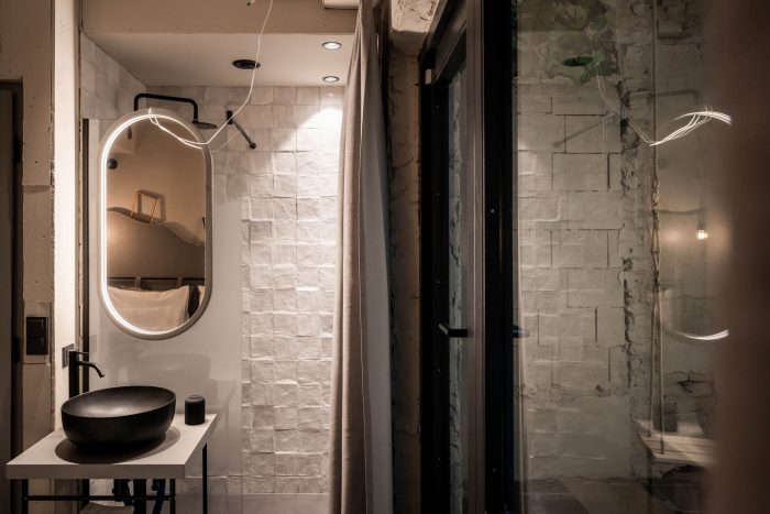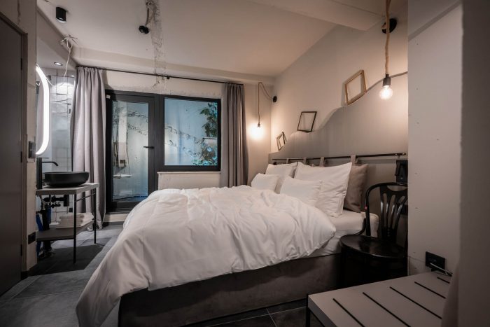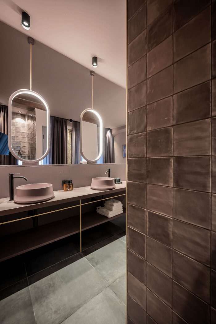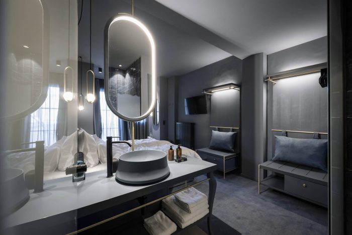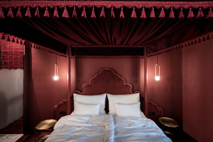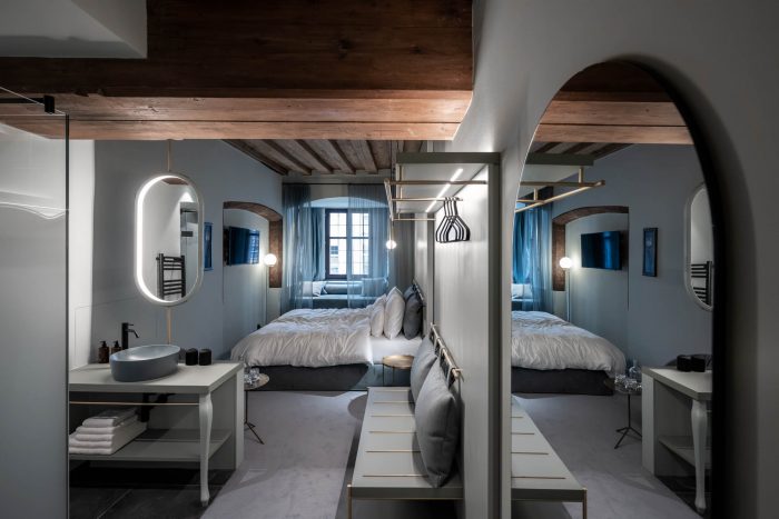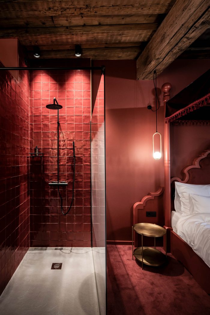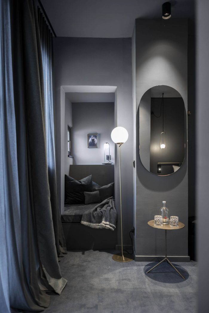 房间本身有一致的颜色代码。每个房间都沉浸在一种单色中,成为巴洛克元素的背景。颜色是客人踏上的时间之旅的一部分。每种色调都表明了各自房间的配置。与浅蓝色的房间相比,红色的房间稍显宽敞,深蓝色的房间有一个阳台,绿色的房间有一个俯瞰庭院的露台,而灰色的房间都是双床的。所有的家具都与颜色相一致:从地毯和瓷砖到墙面颜色、窗帘和家具。巴洛克风格的主题体现在一些特殊的细节上,例如,洗脸台或抽屉柜的一条腿总是 "巴洛克式 "的,但它也在其他配件中闪现。专门制作的一系列穿着华丽的女士的照片进一步强调了巴洛克风格的触感,她们通过异想天开的配饰抓住了 "巴洛克时尚冲击 "的主旋律。