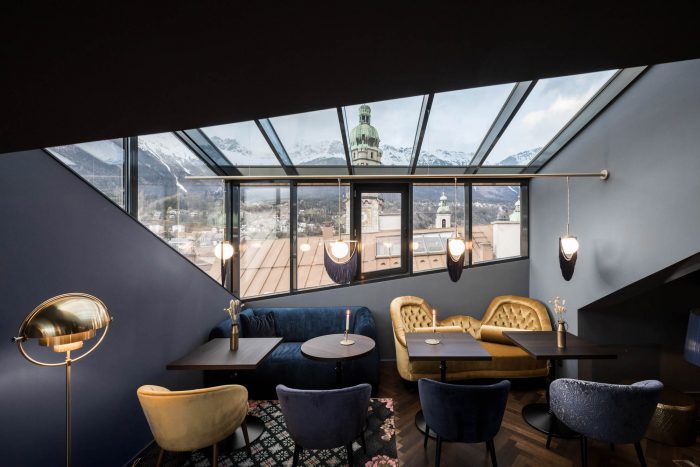 Not far from the famous Goldenes Dachl (Golden Roof), the Altstadthotel has always been a popular destination for famous travellers and historical celebrities, among them Wolfgang Amadeus Mozart, who stayed there as a 13-year-old in 1769. The building is narrow and elongated towards the rear, its front-facing arcade blends perfectly with the historical fabric of the city. During the redesign, a loft level was added to the existing six storeys, which have been extended with delicacy and professional finesse, while respecting the conservation rules. The new loft is meticulously choreographed: on the one hand, it remains alive to the neighbourhood and cityscape by retaining its original slope towards the street-facing front elevation, but at the rear it rises in height and opens up through six glass cubes offering wonderful views over the city skyline. From here, guests can enjoy a unique panorama, taking in the Pulverturm, ski jump and Nordkette.