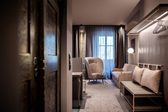 Rock me, Amadeus. The first floor, which has been extended into the courtyard by six rooms, create a unique impact. All the rooms have an overhead glazed terrace and a spacious outdoor area. The highlight of this floor is the “Superpatio” room with its green jungle decor, a small green oasis with antique furniture and an unusual bed. Up one floor, on the second floor, is the “Mozart Suite”, a spacious retreat where Mozart once lay to rest. Here, grandiose elements abound in red and gold. As a tribute to the famous composer, who was a keen gambler, a billiard table graces the room. A further curiosity can be found on the third floor: a “broom cupboard”, the smallest room in the hotel, which remains completely unfinished. With its unplastered walls, it is the “unstyled” centre of an otherwise meticulously designed iconic hotel. As a complete one-off, the signed tennis racket of a famous Wimbledon champion adorns the wall. The fourth floor extends into the neighbouring building – the Frank House – which has a further 10 rooms. On this floor is the “Golden Roof” room, with its opulent gilded furnishings. It was named after the Golden Roof, which can be seen from the bay window.