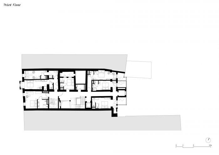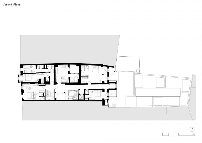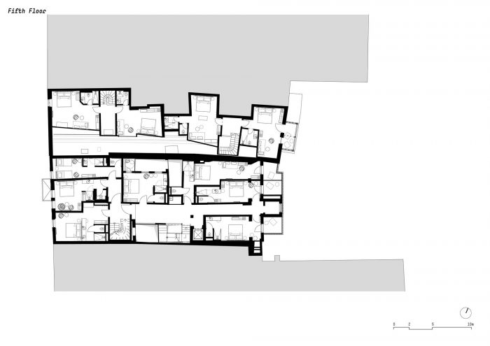 到卧室去。新的房间和套房--或业主亲切地称其为 "房间"--位于下面的楼层。尽管这些现有楼层的建筑不规则,有哥特式的天花板、拱门和不同的房间高度,noa*还是成功地将某种平静带到了疯狂之中。面向街道的客房让您只需从窗户向外看,就能参与到因斯布鲁克老城区的喧嚣之中,而面向内院的客房则以内部的天井或阳台来创造一个隐蔽的田园风光。对于建筑的无窗中央部分,noa*设计了一个特别巧妙的方法来利用这里的空间,同时让这些房间接受自然光。它们通过一楼和六楼之间的一个内部庭院采光,并有一个小型的私人景观露台。