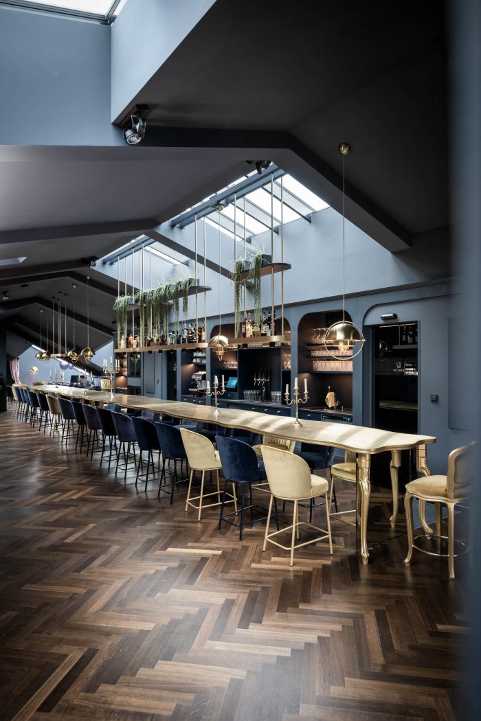 A virtual journey through time. Guests are invited to begin their journey through time on the ground floor: the lift is accessed via a long corridor punctuated by two "mirror locks". Guests see themselves reflected, but at the same time any boundaries are dissolved by the mirrored walls and ceiling and the architecture ceases to exist. From the entrance itself, guests are transported away from their own sense of time. The lift takes them straight to the brand new sixth floor, where a warm welcome awaits. There, the first thing they will notice is a dominant piece of furniture in the long room: a 13-metre-long, custom-made brass table with baroque ornamentation. The table is a multifunctional reception, breakfast buffet, bar, and convivial meeting place in the evening, which is open to non hotel guests as well. The table is further enhanced by the smoked oak floor, and the brass provides a regal contrast with the warm dark blue saturating the room. Blue also features in the name of this iconic venue: “Zur blauen Brigitte” [Blue Brigitte], named after one of the building’s two owners.
