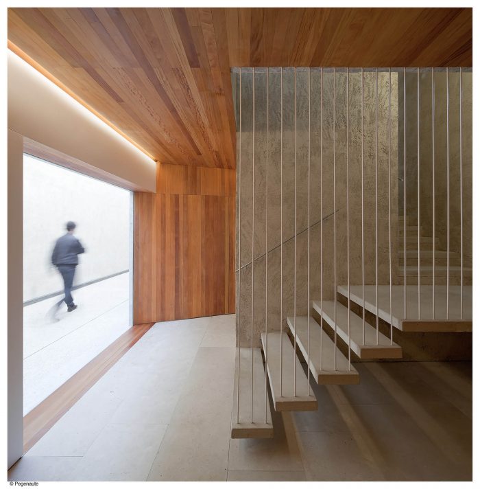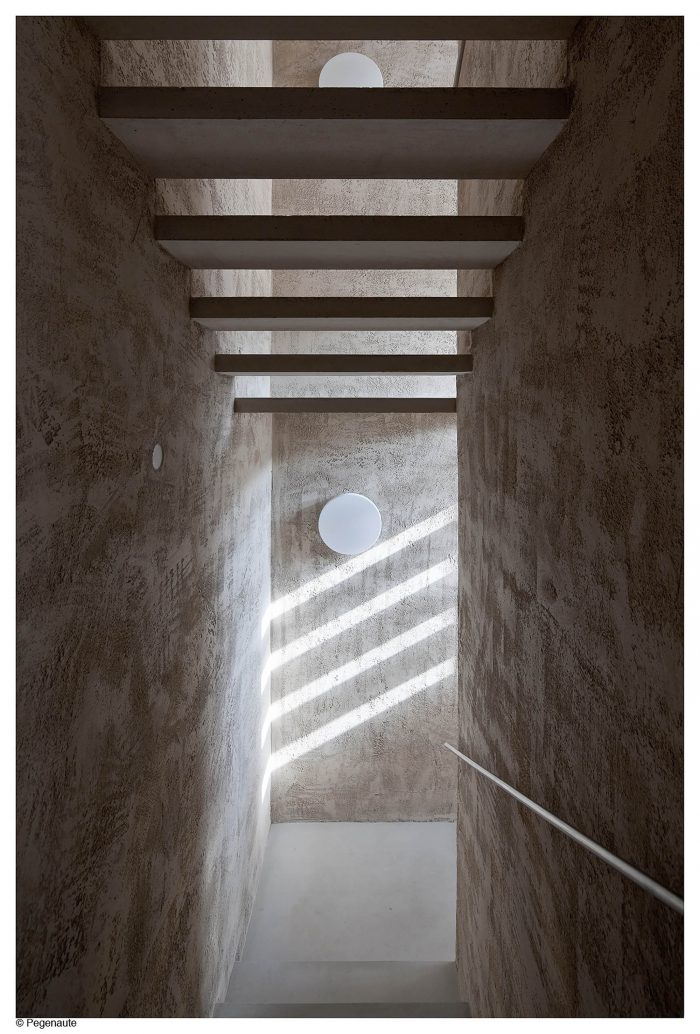 The communications core, in spite of its optimized configuration, we understood it might have more presence that just a series of stairs where occurs the up and down movement. That one was formalized with concrete PISAS which kept free the risersand hence allowed the light pass through: to understand the stair as a singular space beyond of the functional use and to take advantage of the visual depth in spite of its small size.