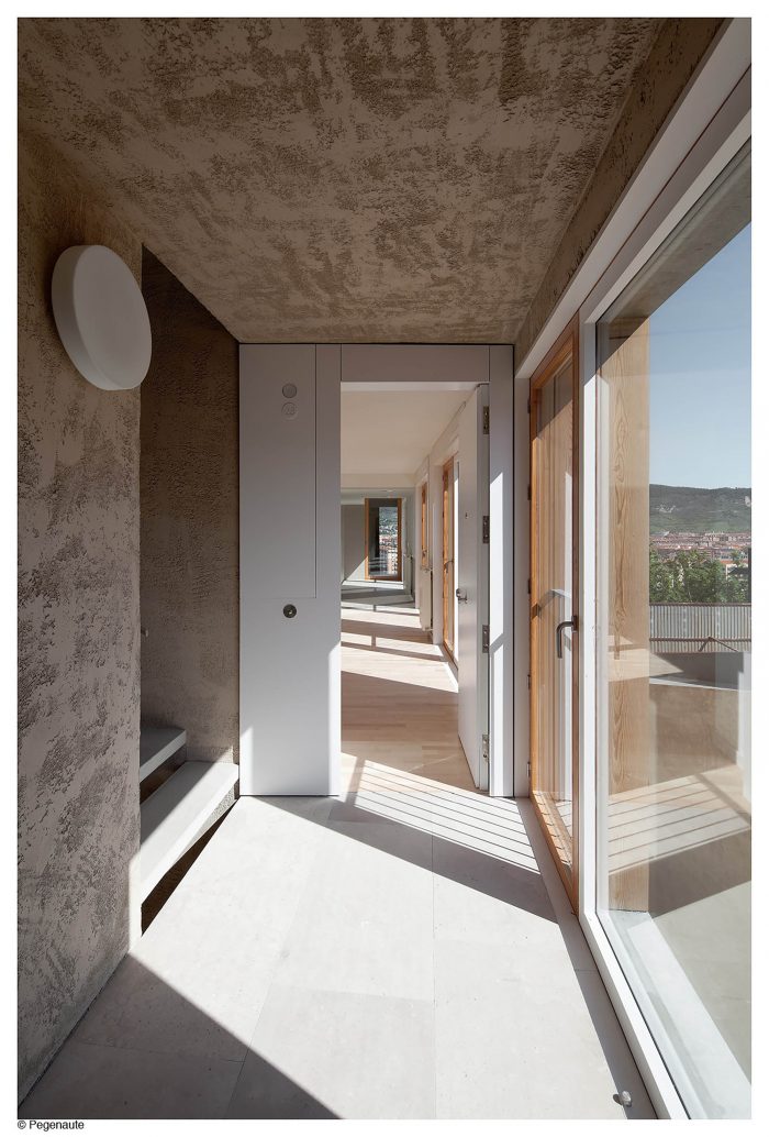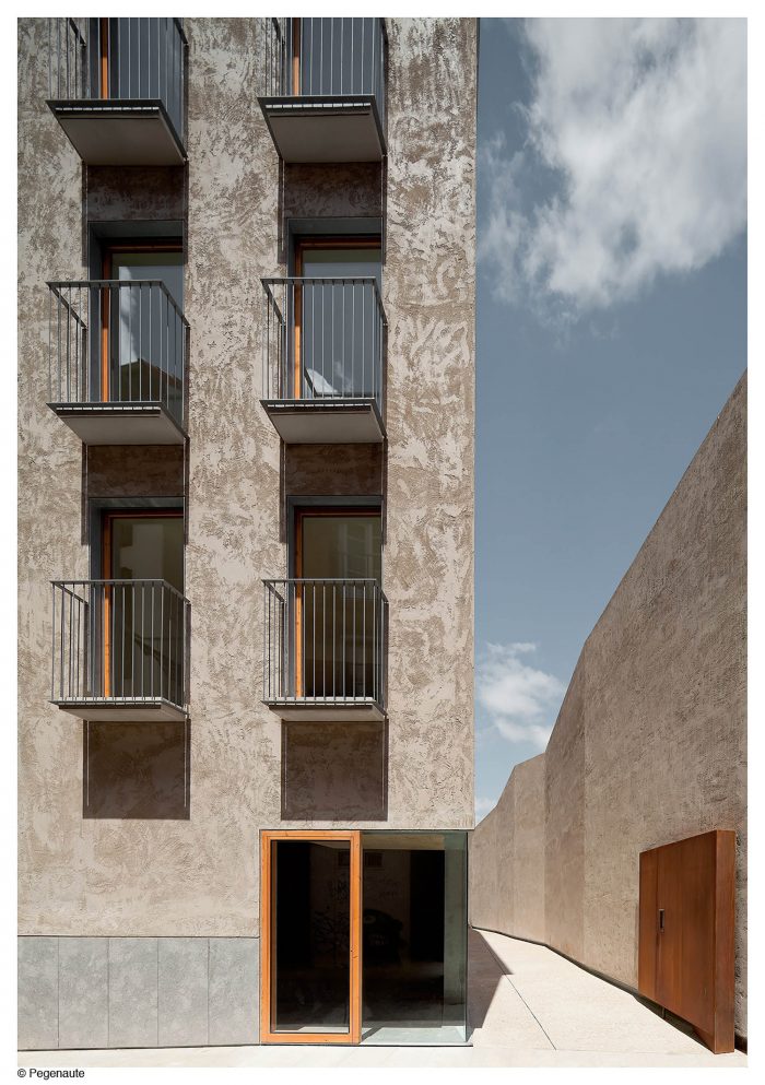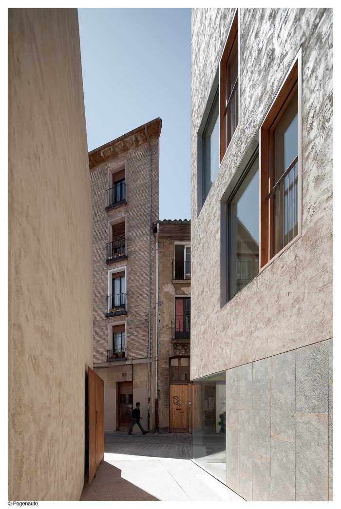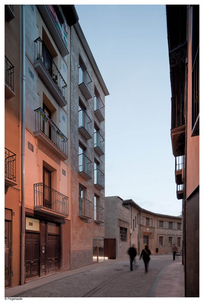 The project was included within a high interest urban plan. The new building, which take up the demolition of an existing one, had to complete the preexisting block and to face a new urban space, a new generation square on the medieval wall. Due to the difficult economic situation, this urban development was postponed, incorporating to the project the definition of a passageway of semi-private nature which allowed the viability of the initiative.