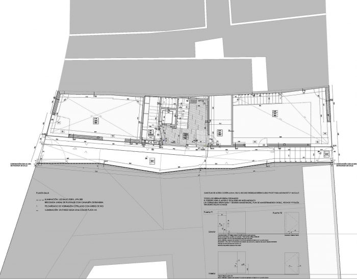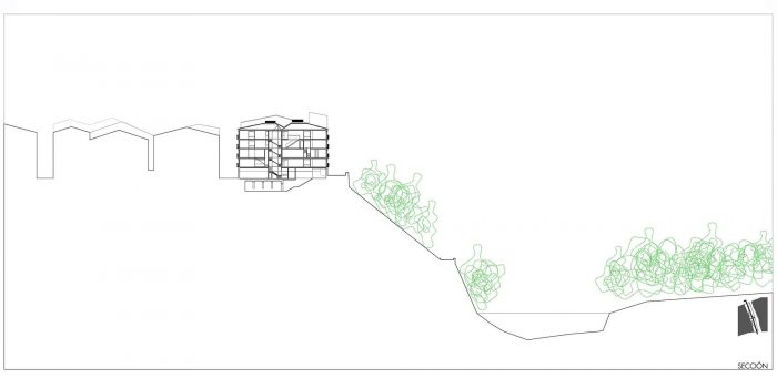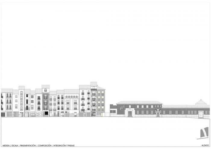 The design of the façades pays attention to two different situations according the position in the public space: in one side from the streets seeking a certain anonymous presence of the proposal giving continuity to what there “happened”: to the normative trace and rigorous of the axial order in Descalzos street, and apparently without regular pattern as consequence of the character of the “back” of the buildings at the Ronda Promenade and in the other side from the new square which transformed the party wall in a singular elevation, free of references and normative context. This façade with double level, the spaces in the wall gain a bigger size, big square windows in comparison with the space which face and the enjoyable landscape with a free order which allowed move the uncertainty of the section and program.