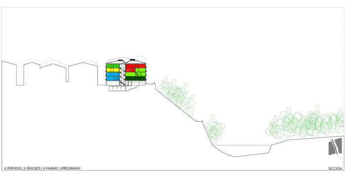 The program consisted basically of apartments to be used as rehousing, which specific detail of the program was unknown at the time of the competition. Exclusively was known that six apartments had to be built; for six rehousing of six families and hence with six different programs, in addition of different trade premises on the ground floor, to promote the commercial activity of the zone and the restoration of a medieval cavern located in the basement of the old building.