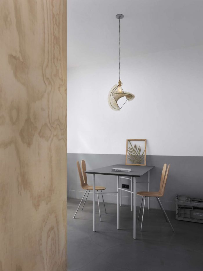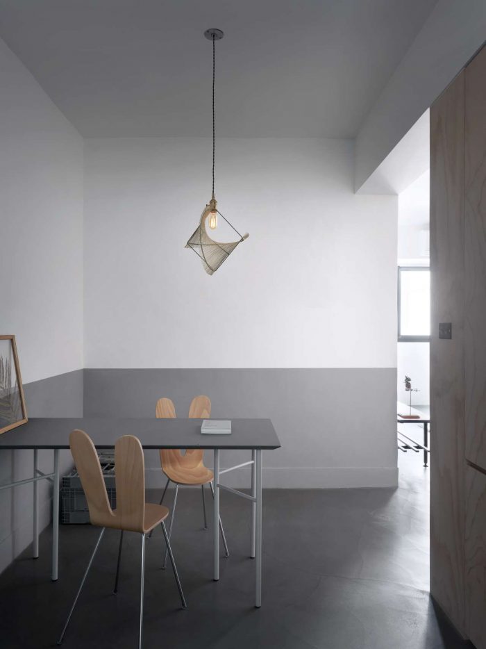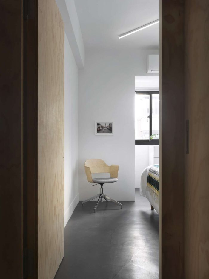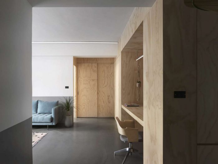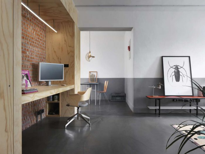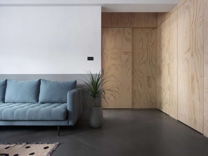 In consultation with the new owner the selected materials reference the environment he grew up in thus bestowing upon the renovated flat a sense of familiarity. White and grey two-toned walls and cement flooring brandish the design’s simplicity, pine plywood conveys a familiar residential atmosphere, while exposed brickwork delineates the study area. The small selection of furniture that has been chosen, such as the light blue sofa, the minimalist red console and the distressed wooden crate used as a coffee table, further accentuate the apartment’s personality without undermining the décor’s subdued ambience, proving that simplicity and character are not contradictory concepts in interior design.