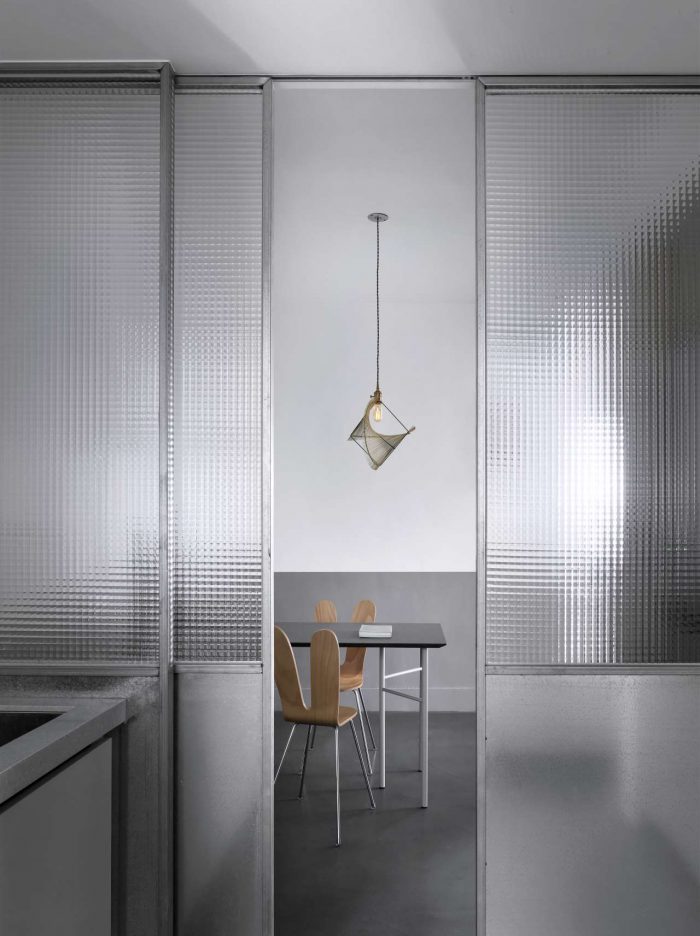 In order to enhance the sense of spaciousness, an essential attribute for such a small-sized apartment, the designers have eschewed decorations and superfluous furnishings in favour of a minimalist aesthetic of simple lines and uncluttered spaces. For the same reason, sliding panels separate the kitchen from the open-plan dining living area allowing the two areas to be perceived as one when opened. Meanwhile, the use of translucent glass allows natural light from the kitchen windows to illuminate the dining area even when the doors are slid shut.