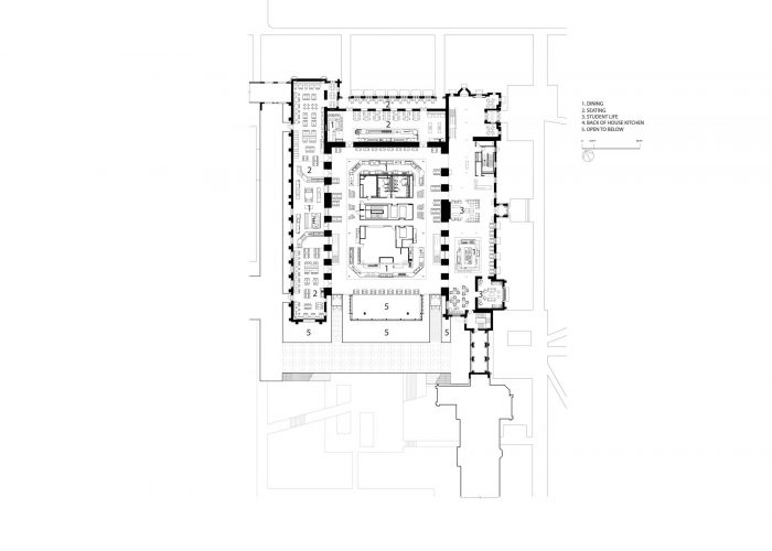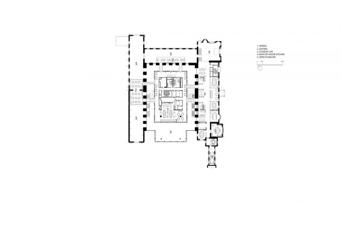 围绕膳食的活动一直是这个历史悠久的食堂的核心活动,也是在 "花园 "里聚集在一起,围绕着分享膳食进行交流和学习的史诗般的理想。今天,受进步的千禧年学生群体的影响,西校区工会的转型特点是在高等教育烹饪产品中采用现代化的理念,以实现更大的文化多样性和新颖性。 建筑中心原有的食堂式厨房已被拆除,取而代之的是裸露的厨房--庆祝食物和它的准备。 这个新的核心,与周围的历史性食堂相抵消,提供了一个不受约束的 "市场 "体验。 受纽约的Eataly、伦敦的Borough Market和费城的Terminal Market等大受欢迎的烹饪市场的启发,西校区联盟的体验为学生提供了大量的食物和烹饪风格,可以从白天的内部街道进入,在热闹的用餐环境中,有足够的地方可以坐下。更常规的座位选择位于历史悠久的餐饮空间,以及大楼南面重新改造的皇冠公社的室外。