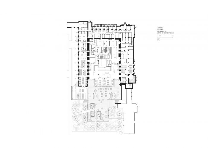 The activity of coming together around a meal was always central to the historic dining hall’s programming as well as the epicurean ideal of coming together in the “garden” to commune and learn around the sharing of a meal. Today, influenced by the progressive millennial student body, the transformation of the West Campus Union is characterized by a modernized philosophy in higher education culinary offerings toward greater cultural diversity and novelty. The original cafeteria style kitchens in the center of the building have been removed and replaced with exposed kitchens – celebrating food and its preparation. This new core, offset from the surrounding historic dining halls, provides an unencumbered “market” experience. Inspired by hugely popular culinary markets like Eataly in New York, Borough Market in London, and the Terminal Market in Philadelphia, the experience at the West Campus Union provides students with a large variety of food offerings and culinary styles, accessible from a day-lit internal street with ample places to sit amidst a lively dining environment. More conventional seating options are located in the historic dining spaces, as well as outside in the reinvented Crown Commons to the south of the building.
