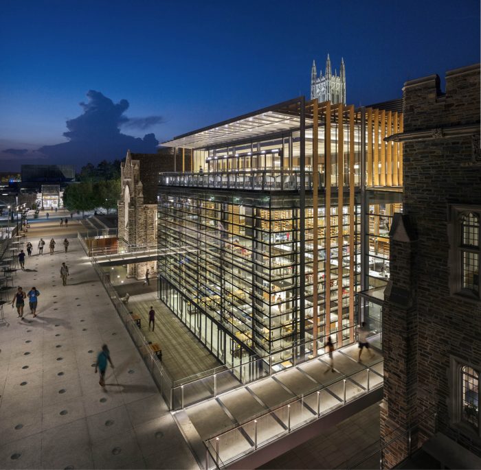 As part of the reconstruction, the nearly hundred-year-old structure has seen its legacy spaces restored to their original architectural significance while the central core of the building has been replaced and reimagined. Trumbauer’s original structure featured an exterior façade constructed out of locally quarried Duke Stone, while the ornate window tracery, gargoyles, and other decorative elements were carefully crafted from Indiana limestone. These historic elements now frame a transparent atrium that provides a focal point for the building and surrounding academic precinct.