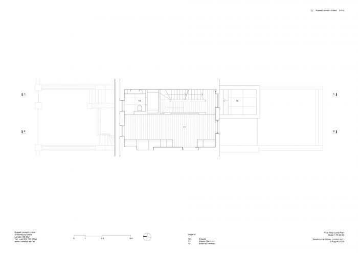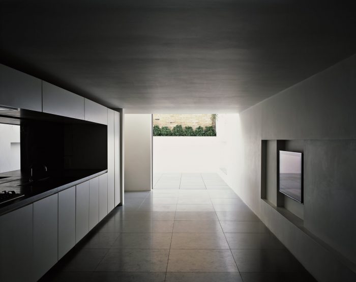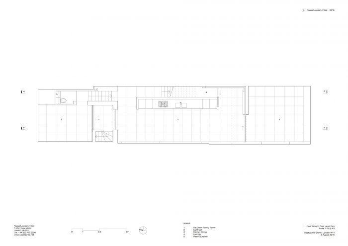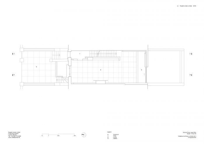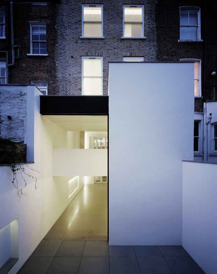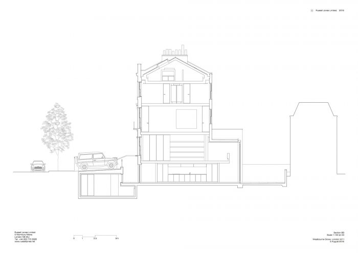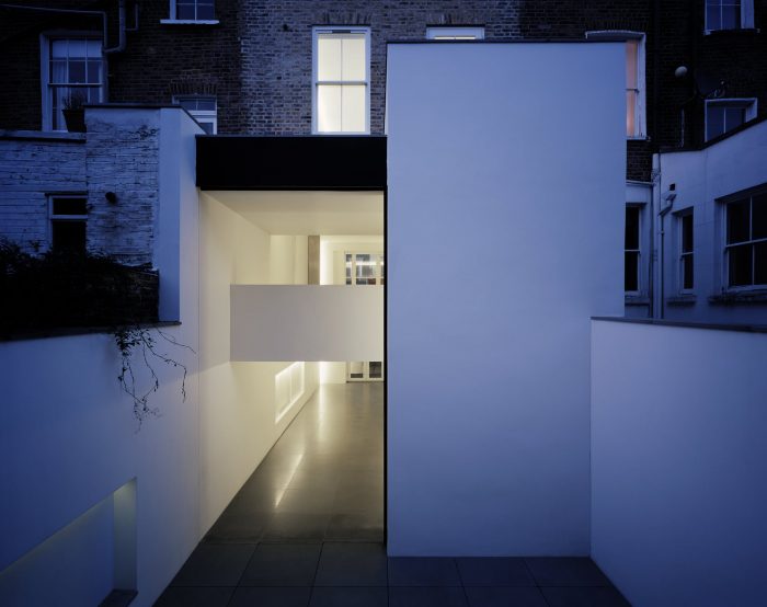 The original half landing and cross wall configuration was superseded by vertically stacked circulation over six levels, and more generously proportioned and planned spaces. The living and dining area, over two levels, are linked by a double height gallery and motorized door, which opens directly onto a rear courtyard. Family accommodation extends beyond the new lower ground level up to the Westbourne Grove pavement.