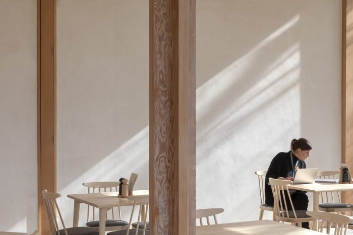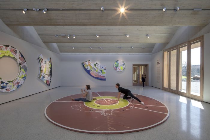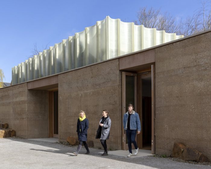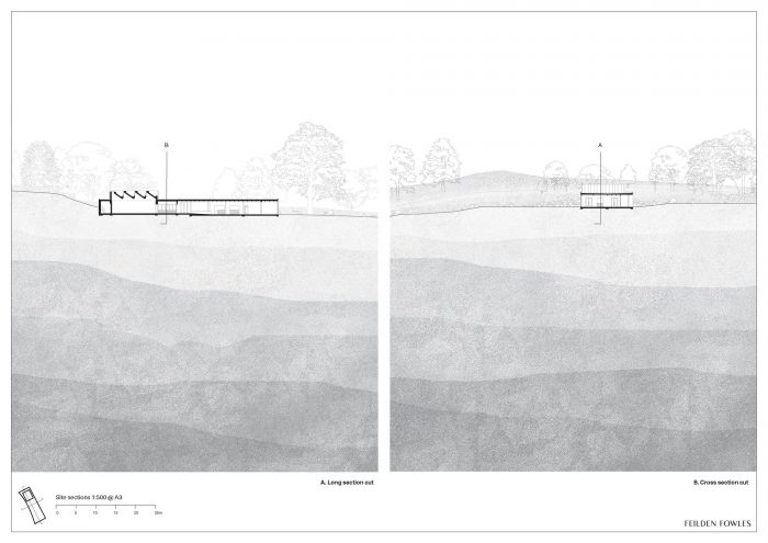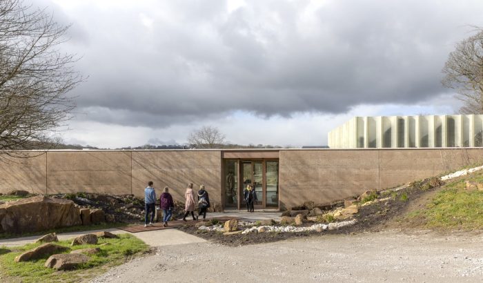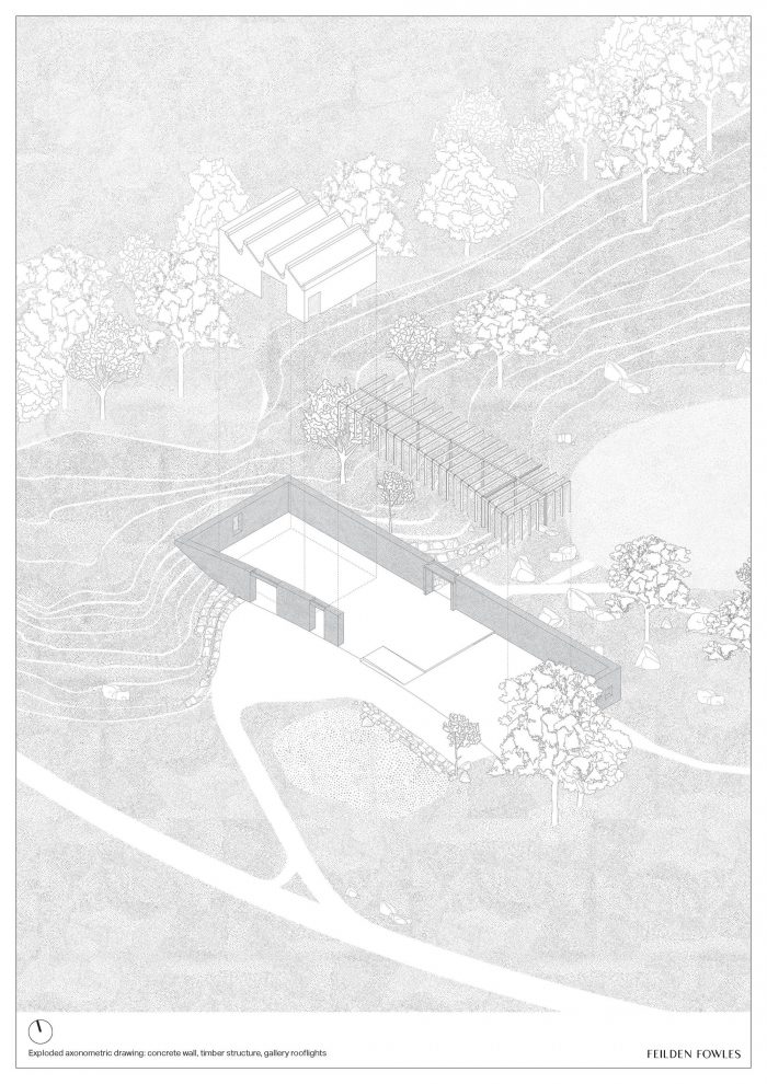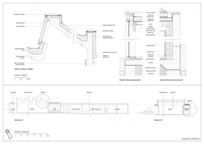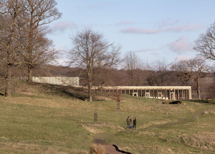 The gallery is distinguished from the rest of the building by a cast in-situ white pigmented concrete, fair-faced on the walls and board-marked on the soffit of the rooflights, with a semi-translucent GRP canopy gently filtering light from above, protecting the artworks on show inside. The space will host temporary exhibitions of work by modern artists to complement the collection in the park’s outdoor space.