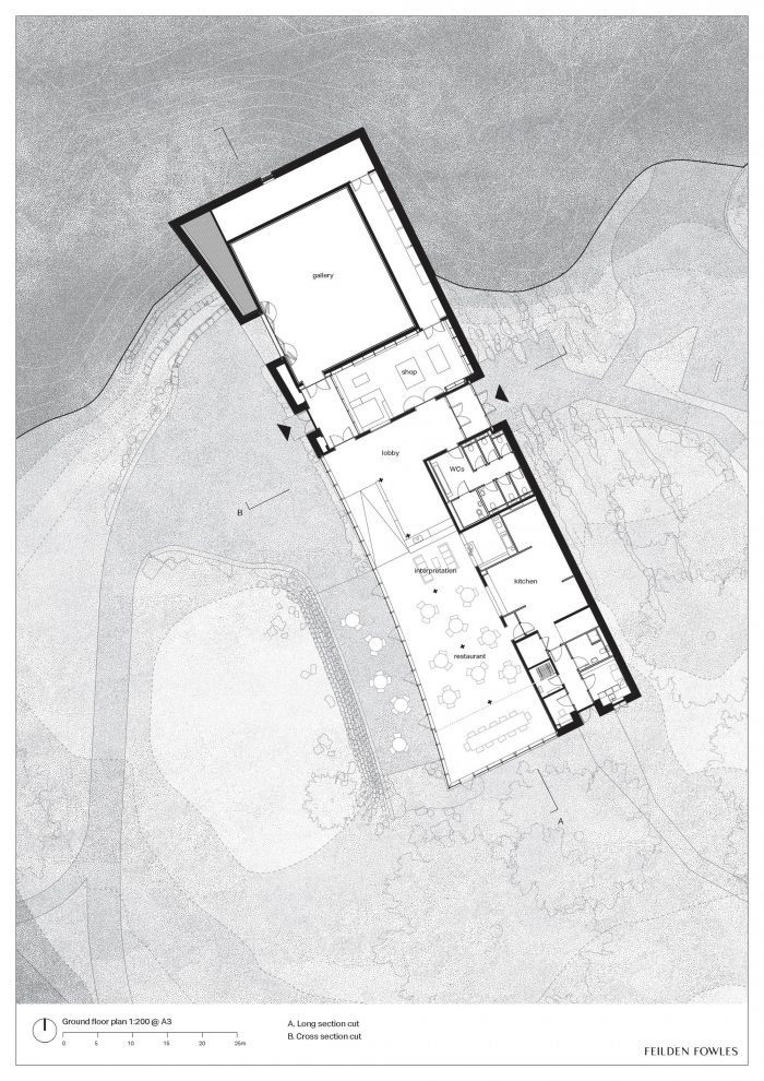 鉴于该地点暴露在恶劣的天气和盛行的风中,很早就决定,一个合适的建筑应在景观中处于低位。受土地艺术和雕塑作品的启发,包括巨大的特定场地艺术作品,如迈克尔-海泽尔的 "双负 "和罗伯特-莫里斯的 "5号天文台",出现了一个概念,即从土地上的切口出现一个整体的形式,这发展成一个依偎在山坡上的建筑,但作为一个坚实的人工干预。